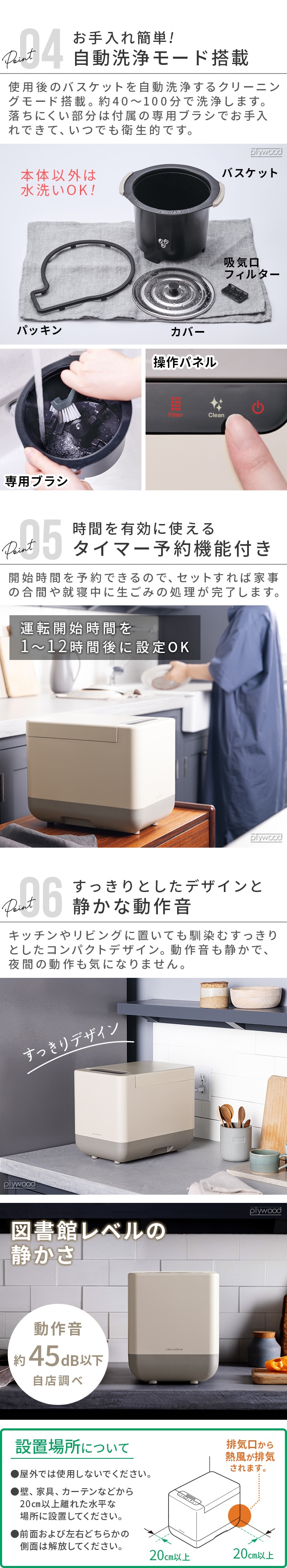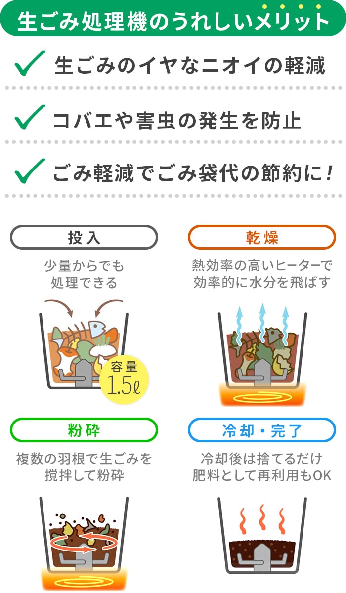 コンパクトな生ごみ専用ゴミ箱 レコルトの人気「生ごみ処理機」にA4サイズのコンパクトモデルが登場!2~3人分の1日分の生ごみを、約3~8.5時間で乾燥・粉砕処理します。臭気鑑定士による検証も実施された活性炭フィルター採用で、処理中のニオイも気になりにくいのが特長です。 |