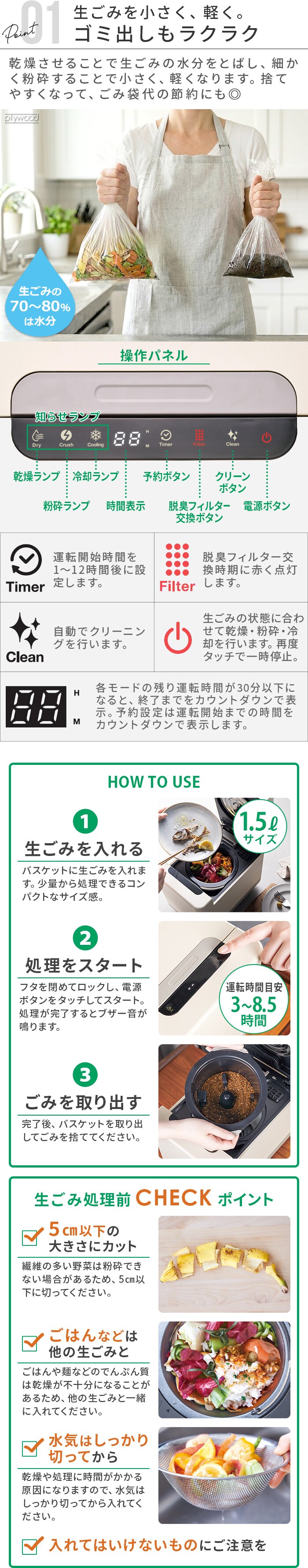 | 大きな生ごみは5cm以下に切り、複数の他の種類の生ごみを一緒に入れると処理しやすくなります。 繊維の多い野菜などは5cm以下に切ってください。羽根に巻き付き、十分に粉砕できないことがあります。 ■入れられるもの ごはん、麺類、魚類、肉類、野菜や果物の皮や切れ端、コーヒーの粉や茶葉、その他(人が食べられる食材、調理物) ※ご家庭で発生する生ごみのみを入れてください ■入れられないもの 【かたい生ごみ】 牛・豚・鶏などの骨、多量の卵の殻のみ、貝殻類 【生ごみ以外のもの】 紙類、プラスチック類、アルミホイル・水切りネット・クッキングシートなど、ガラス・金属・陶磁器など、木や竹でできたもの、動物のふん ※絶対に入れないでください。発火・火災・爆発の原因になります。 引火性のあるスプレー缶など、電池類、石油類、酒類やアルコール分を含むもの、多量の柑橘類(グレープフルーツ・オレンジなど)の皮のみ ※柑橘類には引火性のある成分が含まれています。バスケットの半分以下の量にしてください。 |
