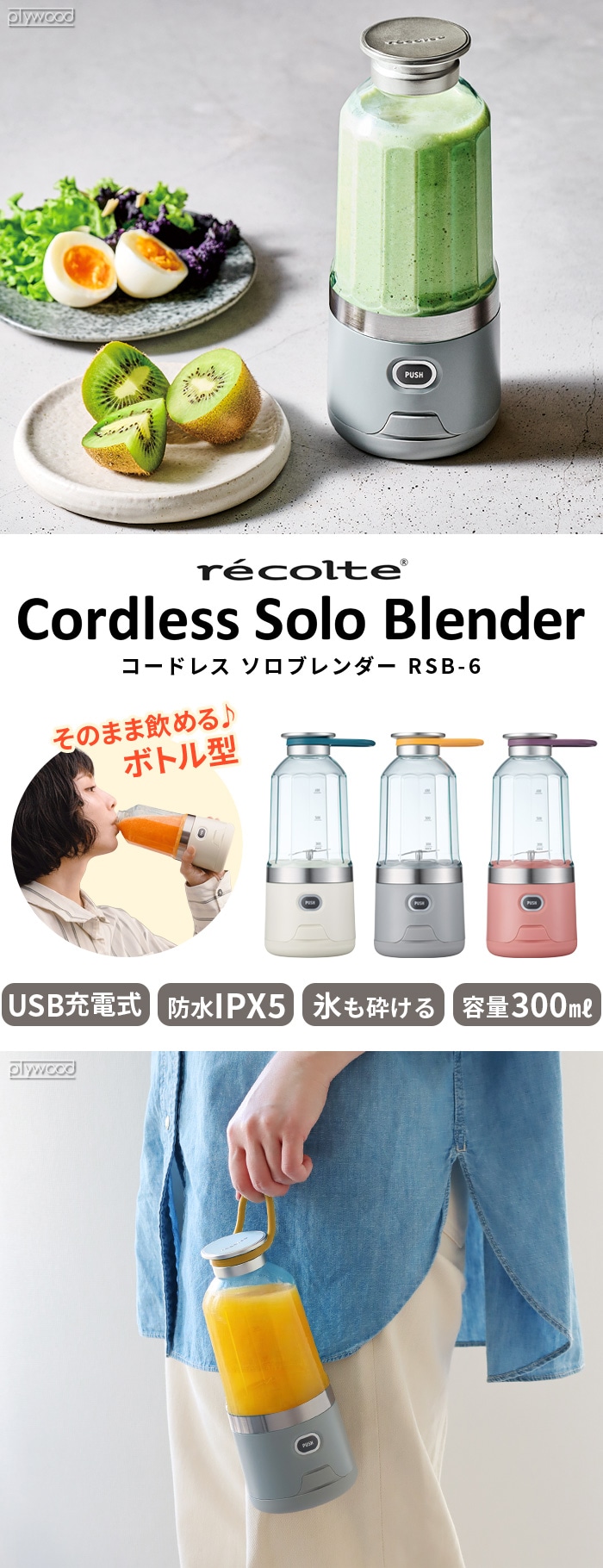 レコルト コードレス ソロブレンダー recolte Cordless Solo Blender ≪ライトグレー RSB-6≫ ミキサー 充電式 小型 ボトル コップ 300ml 氷も砕ける スムージー ジューサー プロテイン ミニ 一人暮らし シェイカー ギフト プレゼント