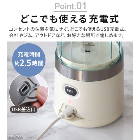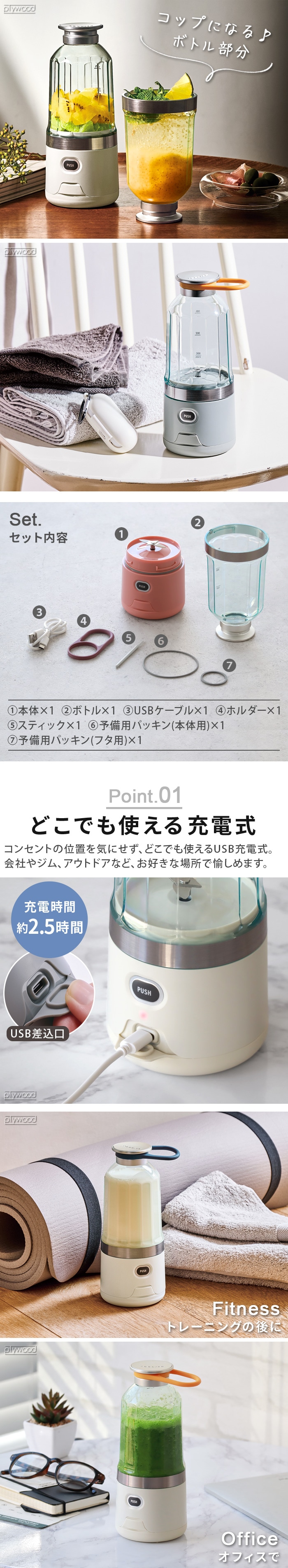 | 本体×1、ボトル×1、カバー×1、ホルダー×1、USBケーブル×1(Type-C)、スティック×1、予備パッキン(本体用)×1、予備パッキン(フタ用)×1、専用レシピブック×1 ※充電にはACアダプタ(別売り)が必要です。 ※アダプタの仕様(充電時:DC5V/1.0A)を確認してご使用ください。 |