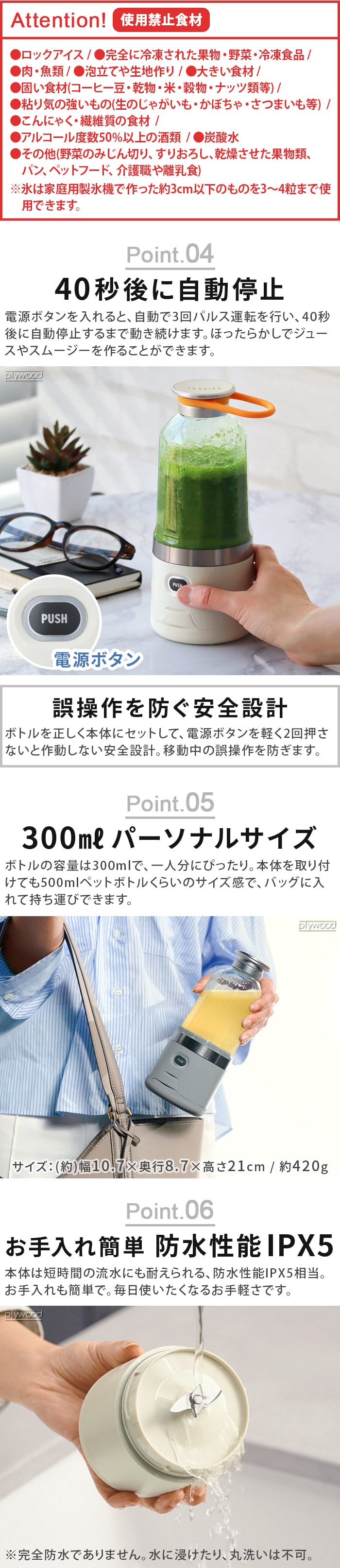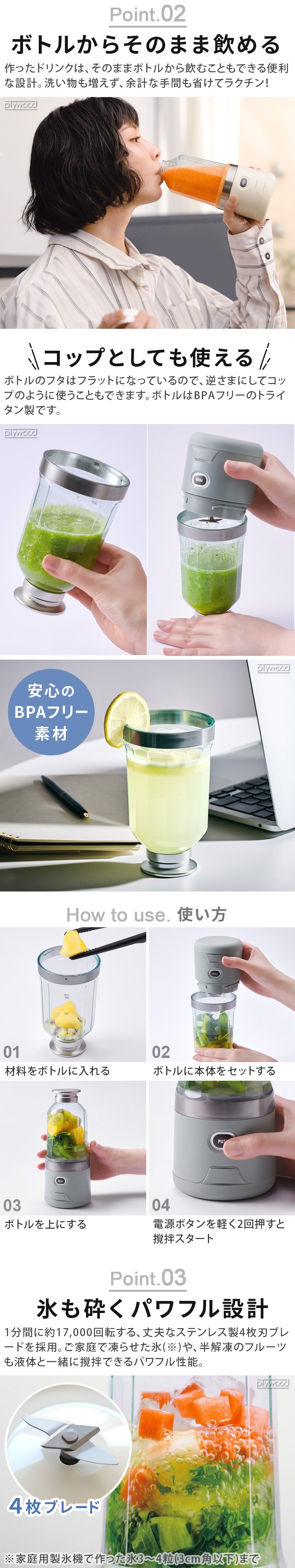 | 本体:ABS樹脂 ボトル:トライタン ブレード:ステンレス |