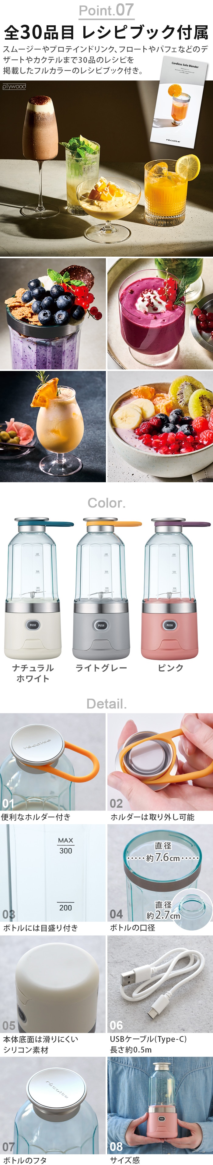 持ち運びに便利なホルダー付属 30レシピの豪華なレシピブック付属 本体:防水性能IPX5相当 ※完全防水ではありません。水に浸けたり、丸洗いしないでください。 |