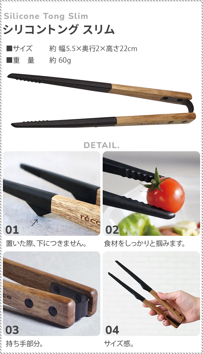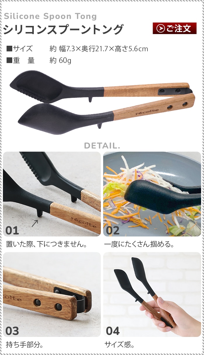 卓上やキッチンでの ちょこっと使いに◎ シリコン×天然木の ミニキッチンツール レコルトより、シリコン製のスパチュラ、ターナー、スプーンの登場です。テーブルクッキングを楽しめる調理家電が揃っている、レコルトならではの小さめのサイズ感。シリコンは耐熱性が高く、柔らかいため調理器具を傷つけにくく、お手入れも簡単。持ち手には天然の木材を使用しており軽量。ツール背面にスタンドがついていて先端が下に付かない設計のため、テーブルにちょこ置きできて便利。食器洗い乾燥機・漂白剤不可。 ※こちらの商品は単品販売です。6点セットではございません。 |