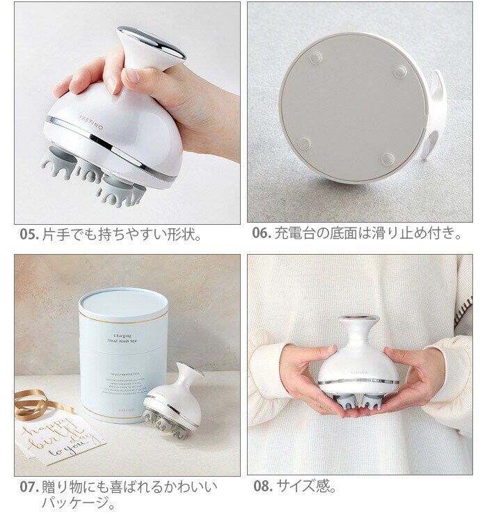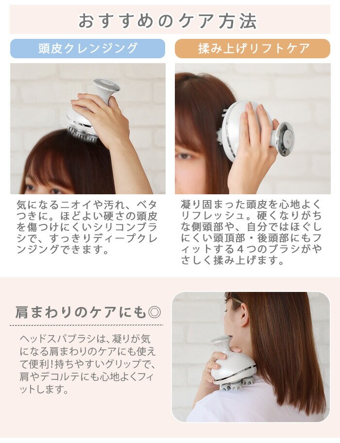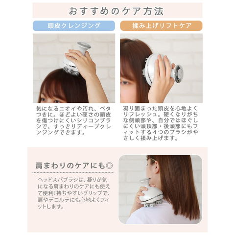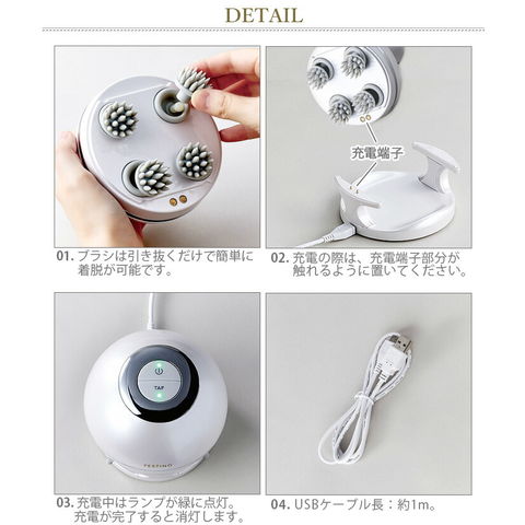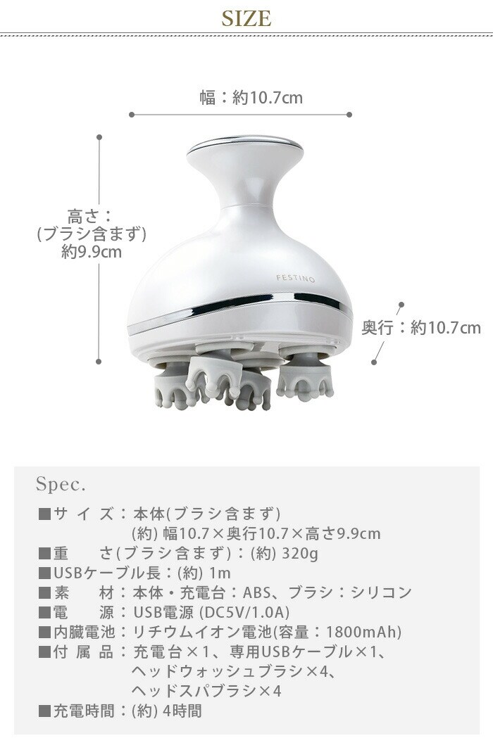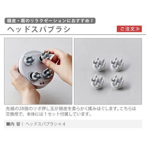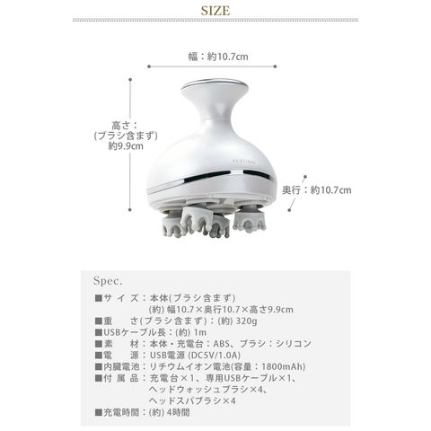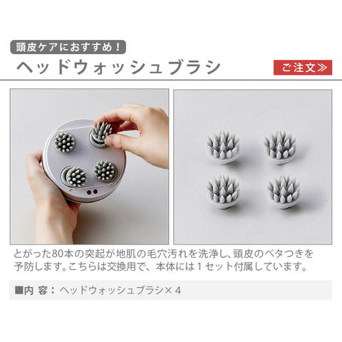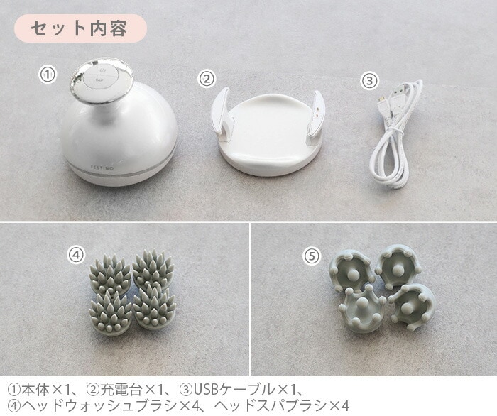 | 本体×1、充電台×1、専用USBケーブル×1、ヘッドウォッシュブラシ×4、ヘッドスパブラシ×4 |