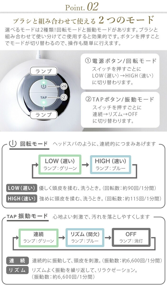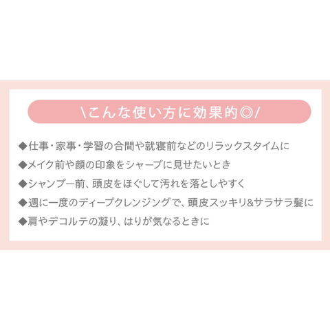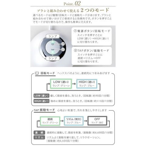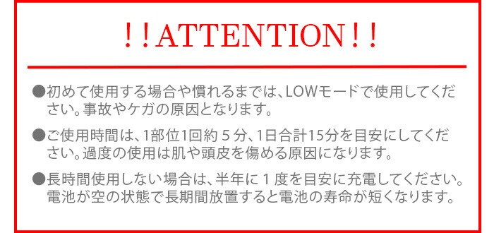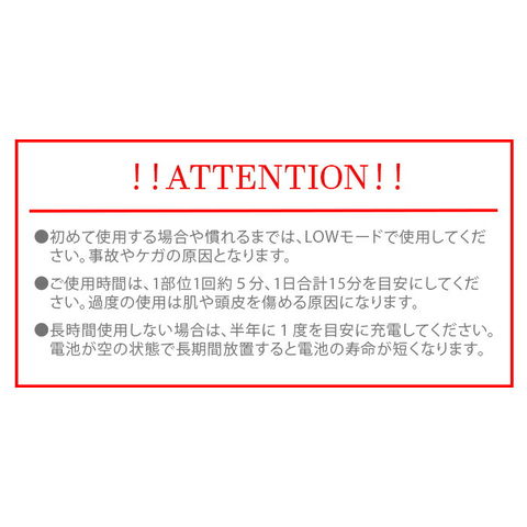 | 初めて使用する場合や慣れるまでは、LOWモードで使用してください。事故やケガの原因となります。 ご使用時間は、1部位1回約5分、1日合計15分を目安にしてください。過度の使用は肌や頭皮を傷める原因になります。 長時間使用しない場合は、半年に1度を目安に充電してください。電池が空の状態で長時間放置すると電池の寿命が短くなります。 |