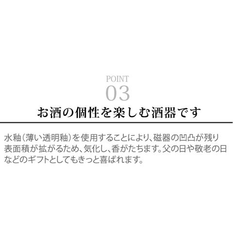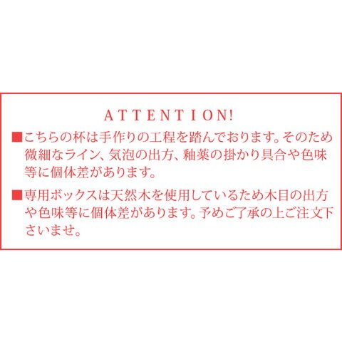 | こちらの杯は手作りの工程を踏んでおります。そのため、微細なライン、気泡の出方、釉薬の掛かり具合や色味等に個体差があります。 専用ボックスは天然木を使用しているため木目の出方や色味等に個体差があります。予めご了承の上ご注文下さいませ。 |