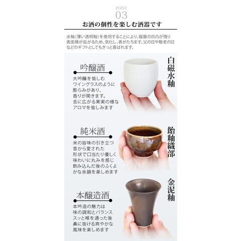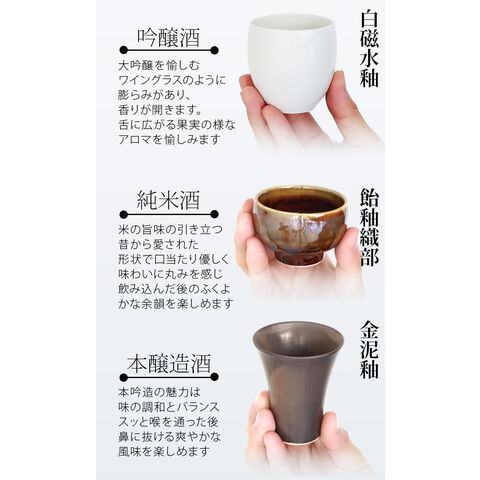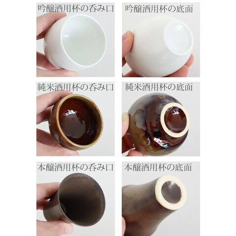 | 吟醸酒用杯:約80g 純米酒用杯:約60g 本醸造酒用杯:約70g |