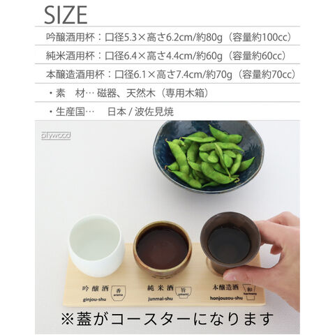| 吟醸酒用杯:(約)口径5.3×高さ6.2cm(容量約100cc) 純米酒用杯:(約)口径6.4×高さ4.4cm(容量約60cc) 本醸造酒用杯:(約)口径6.1×高さ7.4cm(容量約70cc) 木箱:(約)幅24.4×奥行8.8×高さ8.4cm |