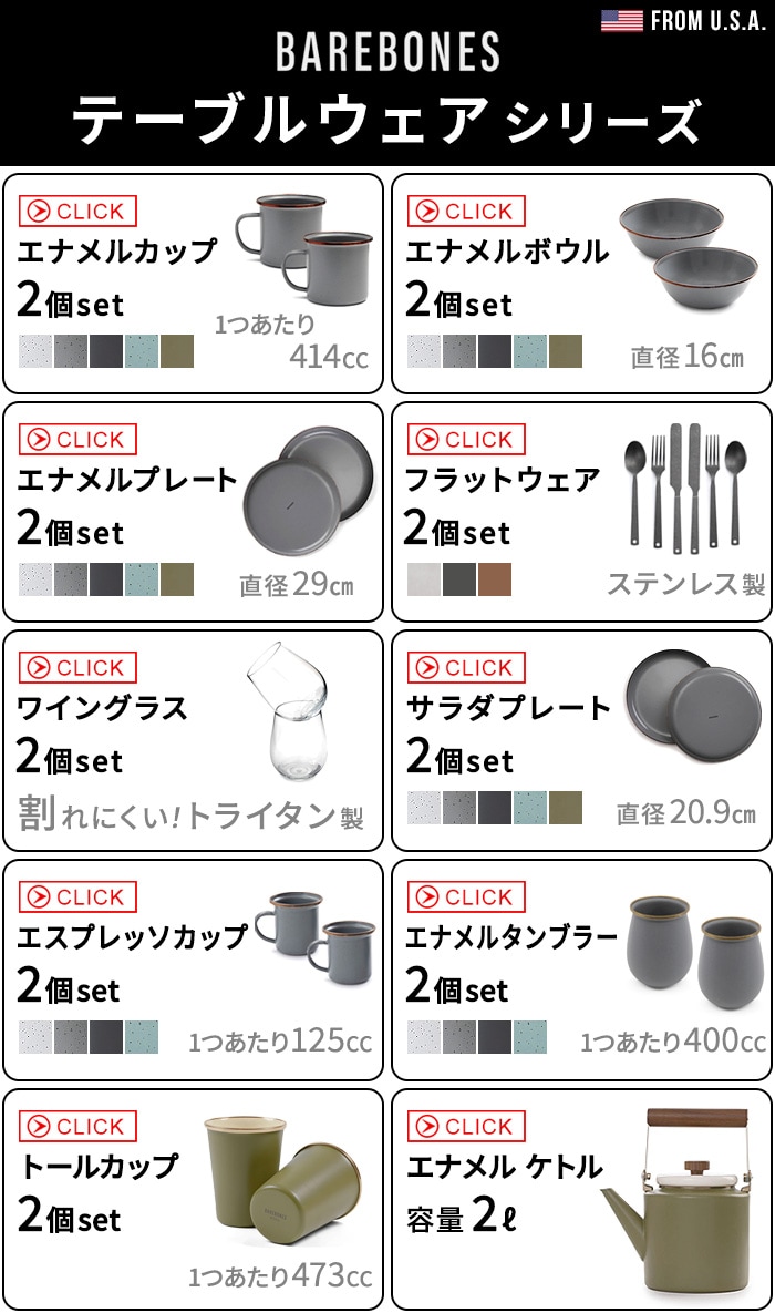 テーブルウェアで 落ち着きのある ディナータイムを演出 BAREBONES(ベアボーンズ)より、洗練されたテーブルウェア各種のご紹介です。ちょっと大人なBBQや、ラグジュアリなグランピングなど、アウトドアシーンを素敵に演出してくれるスタイリッシュなデザインが魅力。シンプルな色合いのため、お料理のジャンルも問いません。どんなシーンにもマッチするので、プレゼントにも最適です。 |