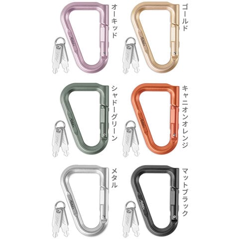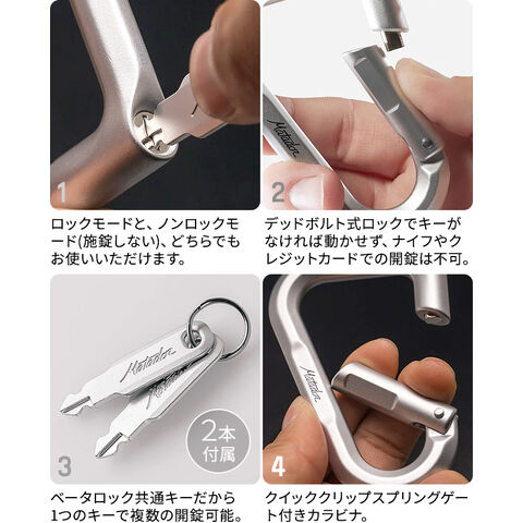 | 簡易式のロックが付いていますが、この鍵はすべてのベータロック共通となっていますので、高い防犯レベルが求められるシーンでのご使用はお控えください。 クライミングや荷物の運搬などには絶対に使用しないでください。 防犯用品としては使用しないでください。 ベータロックは、使用上のミス、製造上のミス、いたずら、破損、その他の方法によるロックやカラビナの故障に関わらず、盗難や紛失、怪我、死亡に対する保険は一切ありません。 ベータロックは体重を支える器具として意図、設計、安全ではないので、耐荷重性はありません。ベータロックはクライミング用ではありません。 |