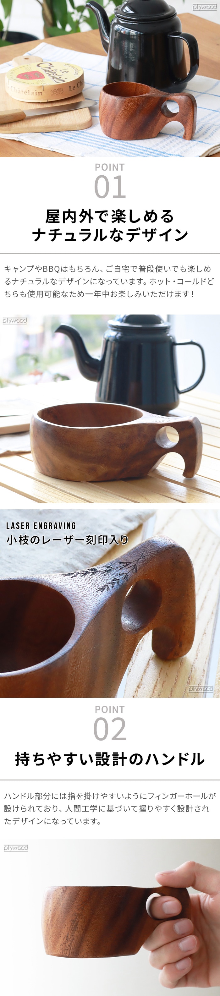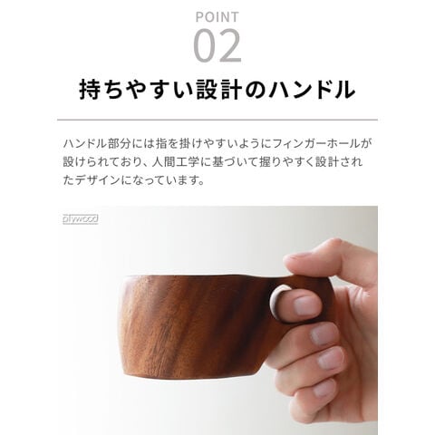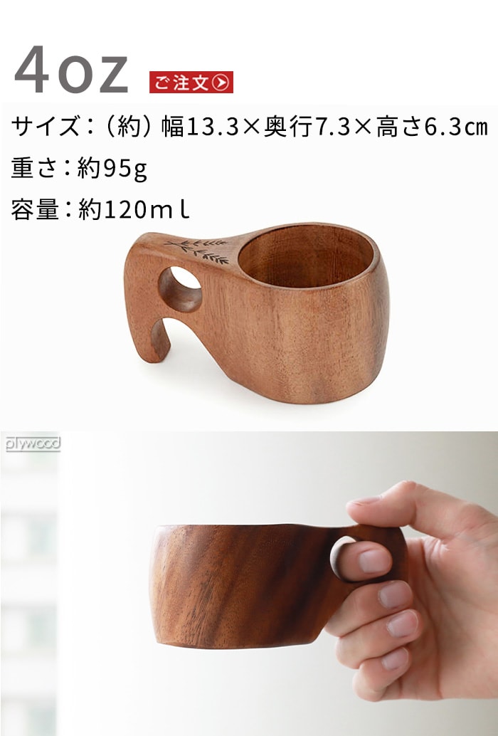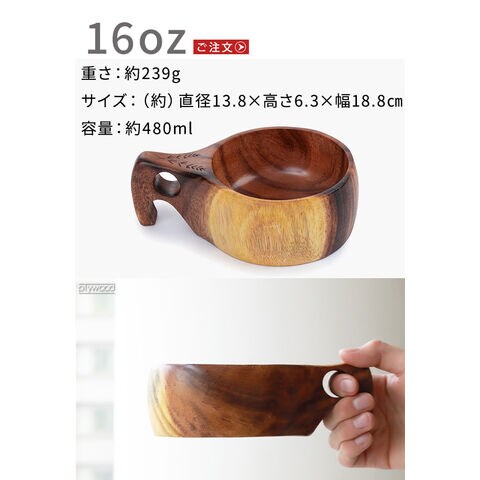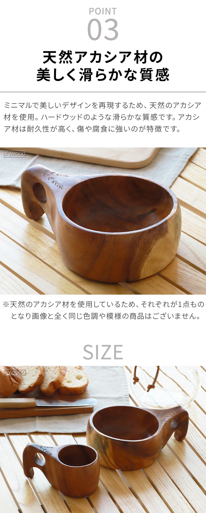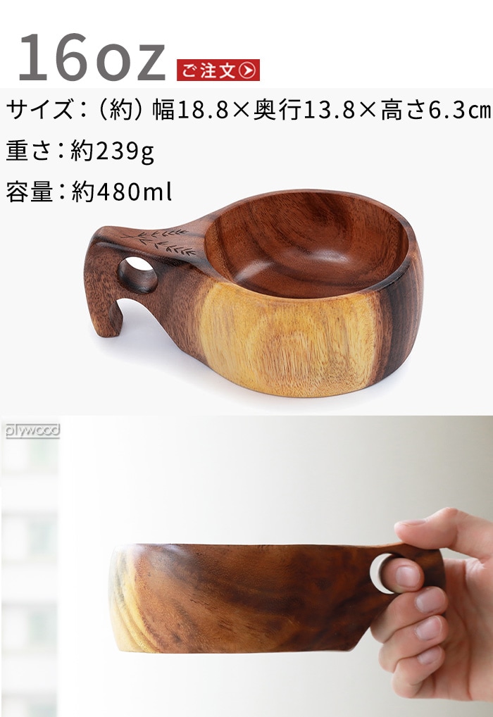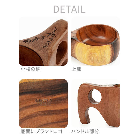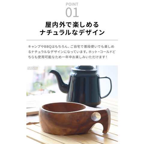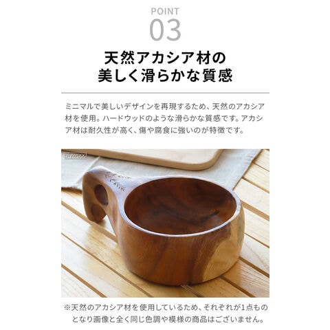 モチーフに作られたマグカップ 北欧の伝統的な木製カップ”Kuksa(ククサ)”にインスパイアされたマグカップ。ククサの美しさを表現するために天然のアカシア材を使用し、滑らかな質感を体現。ハンドル部分は人間工学に基づき、握りやすい設計となっています。ホット・アイスどちらでも使用可能な天然素材の温かみが感じられるマグカップです! |