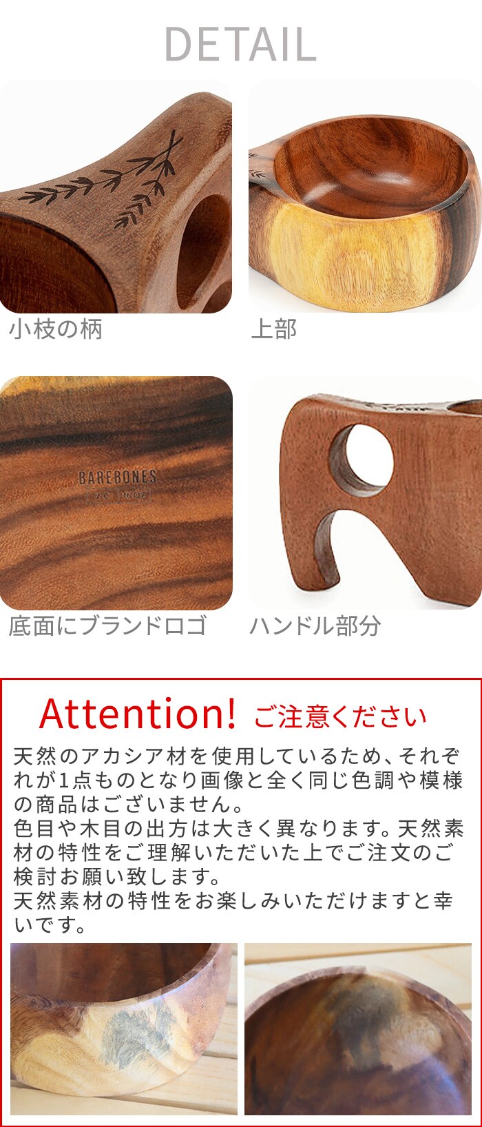 | 電子レンジでの使用禁止 天然のアカシア材を使用しているため、それぞれが1点ものとなり画像と全く同じ色調や模様の商品はございません。色目や木目の出方は大きく異なります。天然素材の特性をご理解いただいた上でご注文のご検討をお願い致します。天然素材の特性をお楽しみいただけますと幸いです。 |