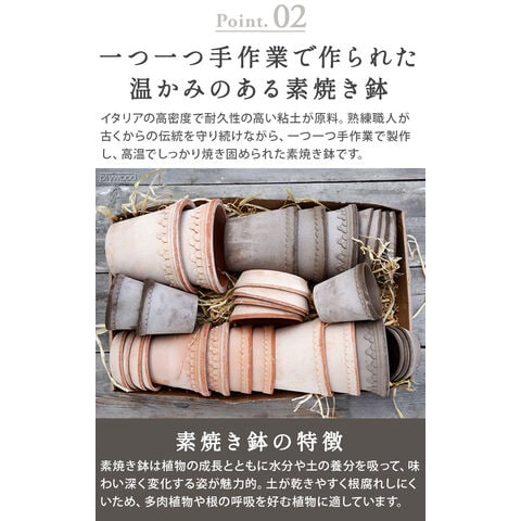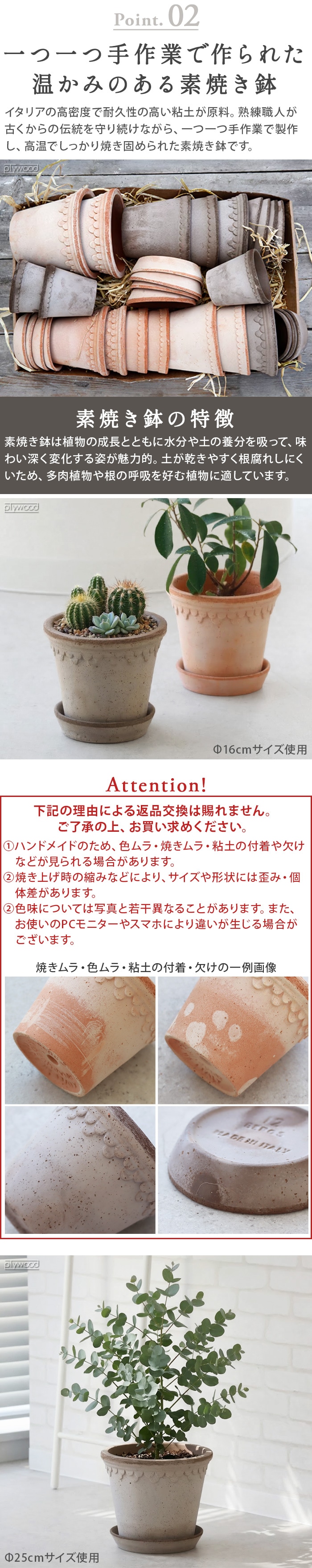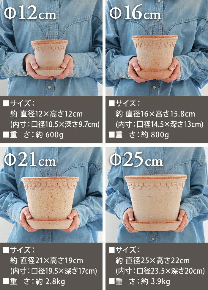 | 12:(約)直径12×高さ12cm (鉢のみの高さ 約11cm) 内寸:(約)口径10.5×深さ9.7cm 16:(約)直径16×高さ15.8cm (鉢のみの高さ 約14.4cm) 内寸:(約)口径14.5×深さ13cm 21:(約)直径21×高さ19cm (鉢のみの高さ 約18.5cm) 内寸:(約)口径19.5×深さ17cm 25:(約)直径25×高さ22cm (鉢のみの高さ 約21.1cm) 内寸:(約)口径23.5×深さ20cm |