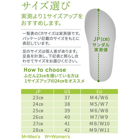 実測より1つ大きいサイズを選ぶことをおすすめします。 一覧表のcmサイズは実測値です。パッケージ記載のサイズをもとに表記しております。 足のサイズは個人差があります。ご使用者さまの足長を計測いただき下記表と照らし合わせて、サイズをご選択ください。 |