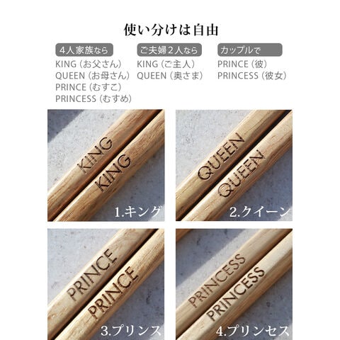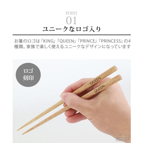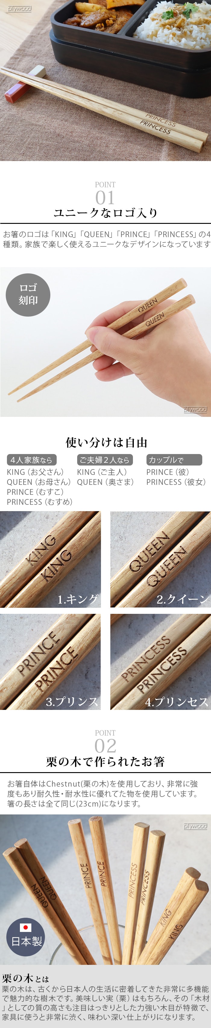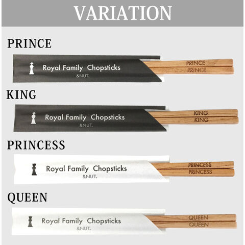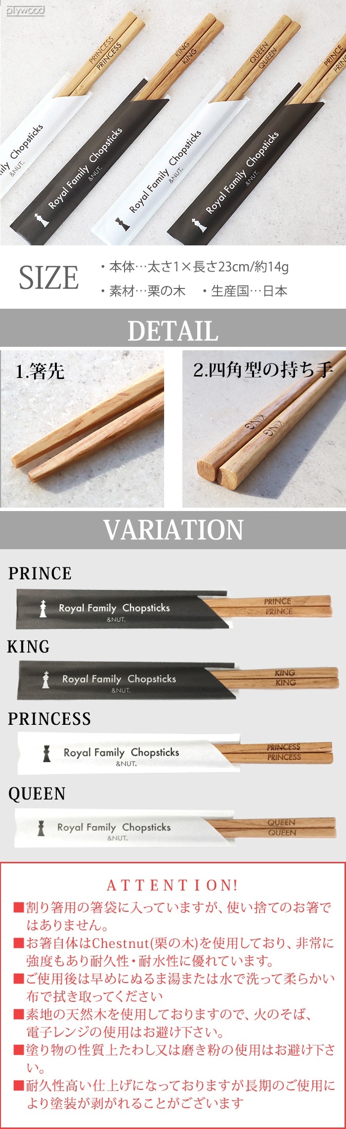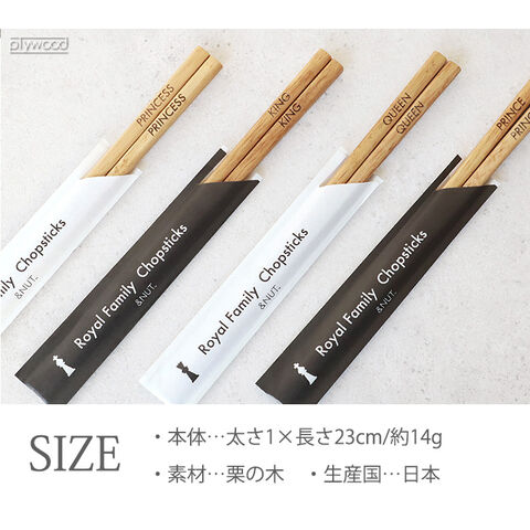 ユニークなお箸 &NUTよりファミリーで使い分けができるお箸が登場。割り箸用の箸袋に入っていますが、使い捨てのお箸ではありません。お箸自体はChestnut(栗の木)を使用しており、非常に強度もあり耐久性・耐水性に優れています。箸の先端は四角型になっており、食べ物がつかみやすくなっています。ロゴは「KING」「QUEEN」「PRINCE」「PRINCESS」の4種類。 |