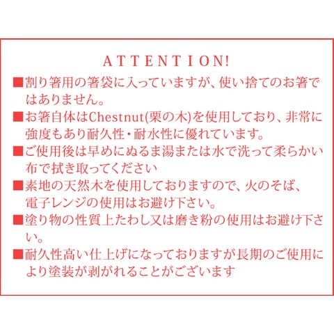 | MADE IN JAPAN 割り箸用の箸袋に入っていますが、使い捨てのお箸ではありません。 お箸自体はChestnut(栗の木)を使用しており、非常に強度もあり耐久性・耐水性に優れています。 ご使用後は早めにぬるま湯または水で洗って柔らかい布で拭き取ってください。 素地の天然木を使用しておりますので、火のそば、電子レンジの使用はお避け下さい。 塗り物の性質上たわし又は磨き粉の使用はお避け下さい。 耐久性高い仕上げになっておりますが長期のご使用により塗装が剥がれることがございます。 |