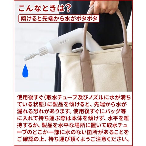 | 充電時間めやす:約4時間 使用時間めやす:約2時間 水以外にアルコール消毒液・化粧水も対応 ※取扱説明書に「水道水以外は使用しないでください」と記載してますが上記液体も使用可能です。 ※腐食性、粘度の高い液体は入れないでください。 |
