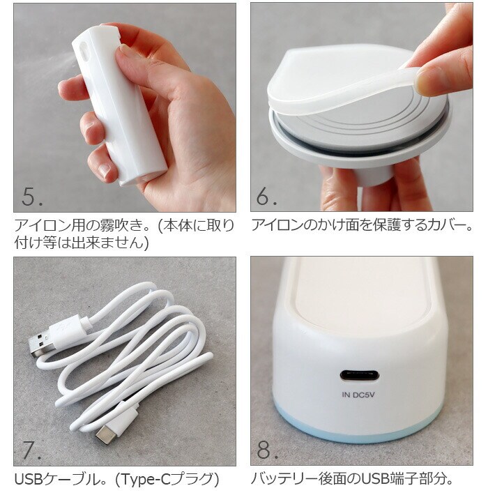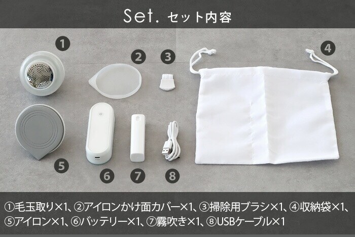 | バッテリー×1、アイロン×1、毛玉取り×1、アイロンかけ面カバー×1、掃除用ブラシ×1、収納袋×1、霧吹き×1、USBケーブル×1 電源プラグ(ACアダプター)は別売り。 |