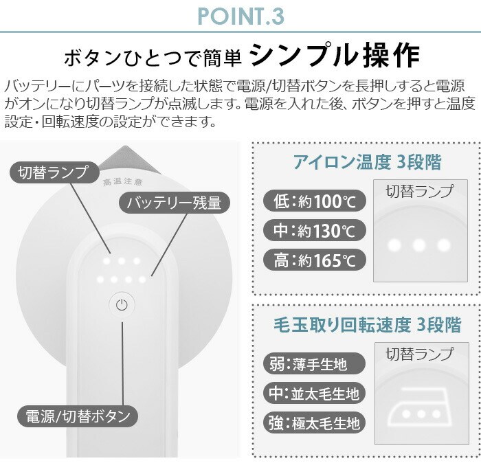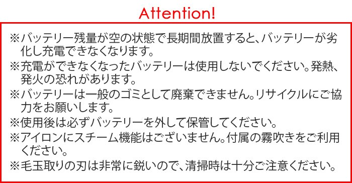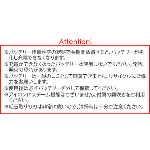 | バッテリー残量が空の状態で長期間放置すると、バッテリーが劣化し充電できなくなります。 充電する際はアイロン・毛玉取りのパーツを外した状態で行ってください。 コンセントから充電する際には電源プラグ(別売り)が必要です。 充電中は使用不可。 アイロンにスチーム機能はございません。付属の霧吹きをご利用ください。 アイロンかけ面カバーを付けたまま電源を入れないでください。 毛玉取りの刃は非常に鋭いので、清掃時は十分ご注意ください。 充電ができなくなったバッテリーは使用しないでください。発熱、発火の恐れがあります。 使用後は必ずバッテリーを外して保管してください。 |