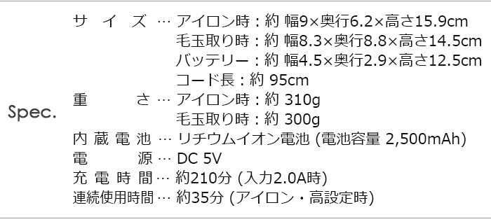 | アイロン時:(約)幅9×奥行6.2×高さ15.9cm 毛玉取り時:(約)幅8.3×奥行8.8×高さ14.5cm バッテリー:(約)幅4.5×奥行2.9×高さ12.5cm 収納袋:(約)幅25×奥行22.5cm コード長:(約)95cm |