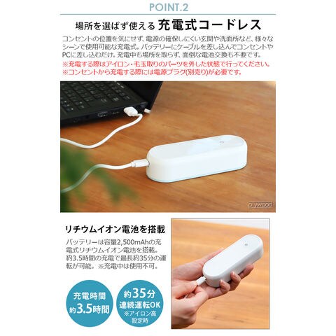 充電式 アイロン×毛玉取り アイロン・毛玉取りの2通りの使い方ができる、充電式のミニアイロンです。 パーツを付け変えるだけで衣類の毛玉もシワも1台で解決!パーツはマグネットの磁力により簡単に着脱ができます。 電源を必要としないUSB充電式なので場所を選ばずどこでもご使用いただけます。コンパクトな手のひらサイズは旅先への持ち運びも便利!手が疲れにくい約310gの軽量設計。3段階切り替えの温度設定と回転速度設定が可能と実用性もバツグンです。 ※アイロンにスチーム機能はありません。 |