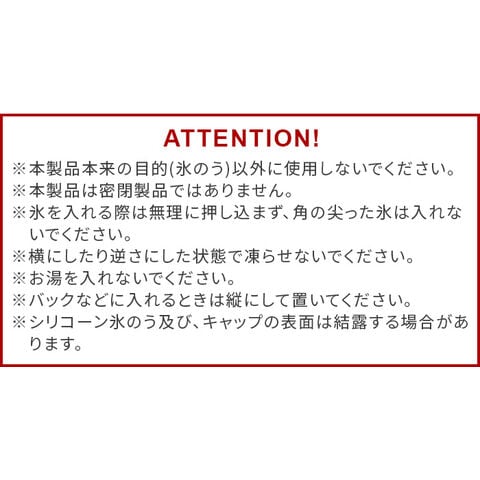 | 沸騰消毒、食器洗浄機、食器乾燥機は使用不可。 冷たさキープホルダーは冷蔵庫・冷凍庫に入れないでください。 本製品本来の目的(氷のう)以外に使用しないでください。 本品は治療を目的としたものではありません。 本製品は密閉製品ではありません。 氷を入れる際は無理に押し込まず、角の尖った氷は入れないでください。 横にしたり逆さにした状態で凍らせないでください。 水または氷以外のものを入れないで下さい。 お湯を入れないでください。 バックなどに入れるときは縦にして置いてください。 シリコーン氷のう及び、キャップの表面は結露する場合があります。 水や氷を入れた状態で放置しないでください。 次のことを必ず守って正しく使用してください。血行障害や凍傷、負傷事故を防ぐために、次のような使い方はしないでください。 ・就寝時の使用 ・長時間、同一部位の冷却 ・妊娠中または妊娠していると思われる場合 ・シリコーン氷のうに摩擦、損傷のある場合 |