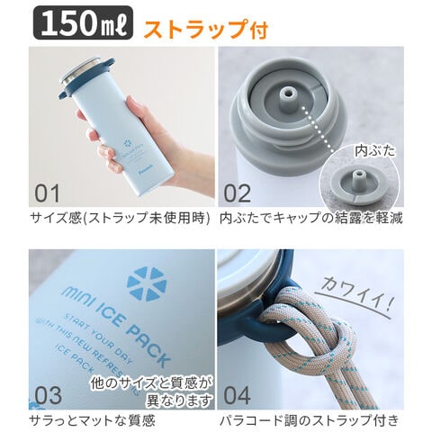 | (約)幅8.5×奥行6.2×高さ17cm ※ストラップ含みません (氷のう+キャップのみ:約 幅5.8×奥行5.8×高さ15.5cm) 氷のう口径:約2.4cm |