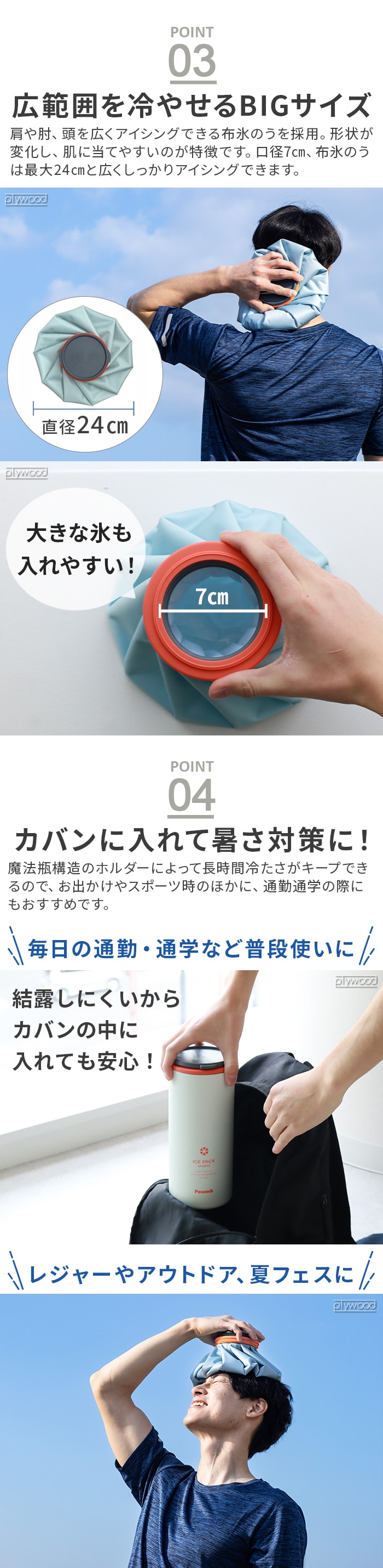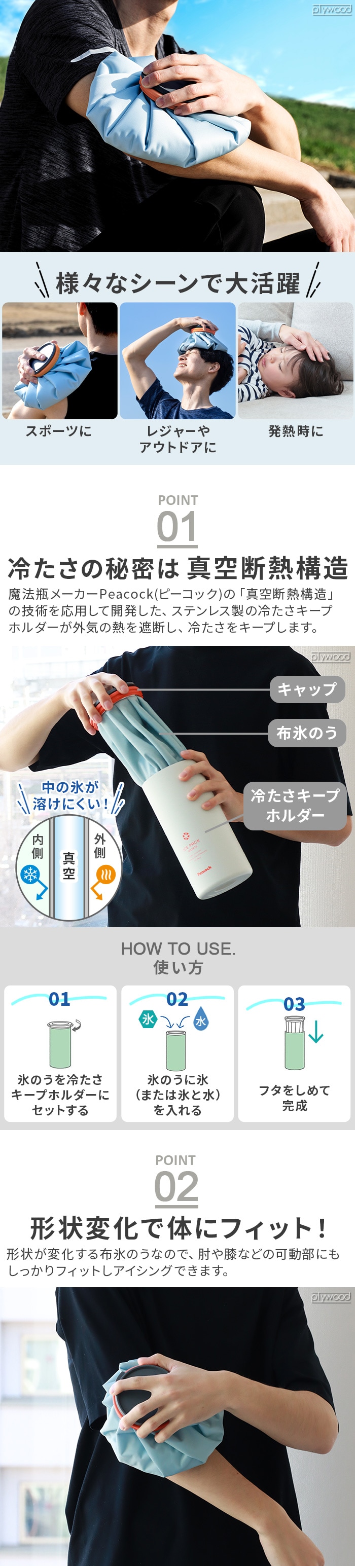 冷たさ続くBIGな氷のうが登場! 1950年創業の魔法瓶メーカー、「Peacock(ピーコック)」からスポーツ時のアイシングや発熱時に活躍する超ビッグな氷のうが登場。布氷のうなので広範囲を一気に冷やすことができます。スポーツシーンはもちろん、通勤通学や熱中症対策など幅広く使えます. |