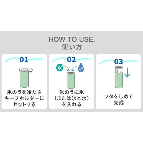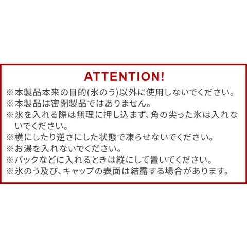 | 本製品本来の目的(氷のう)以外に使用しないでください。 本製品は密閉製品ではありません。 氷を入れる際は無理に押し込まず、角の尖った氷は入れないでください。 横にしたり逆さにした状態で凍らせないでください。 お湯を入れないでください。 バッグなどに入れるときは縦にして置いてください。 氷のう及び、キャップの表面は結露する場合があります。 |