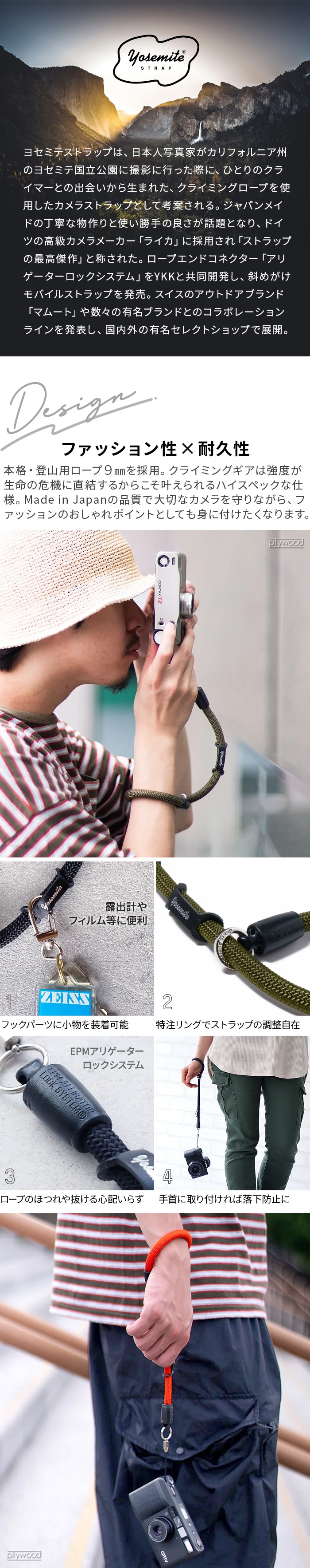 ![]() 本物品質ハイスペックな カメラストラップ 本格クライミングロープを使用した、コンパクトカメラにぴったりのヨセミテのストラップハンドル。安心の日本製で大切なカメラをタフなクライミングロープで守ります。上質な牛レザー製フックパーツも装備し、カラビナ等で露出計やフィルムなどの小物を装着するのに便利です。手首へ安全に取り付けることによって、偶発的な滑りや落下を防止します。 ![]() ![]() ![]() ![]() ![]() ![]()