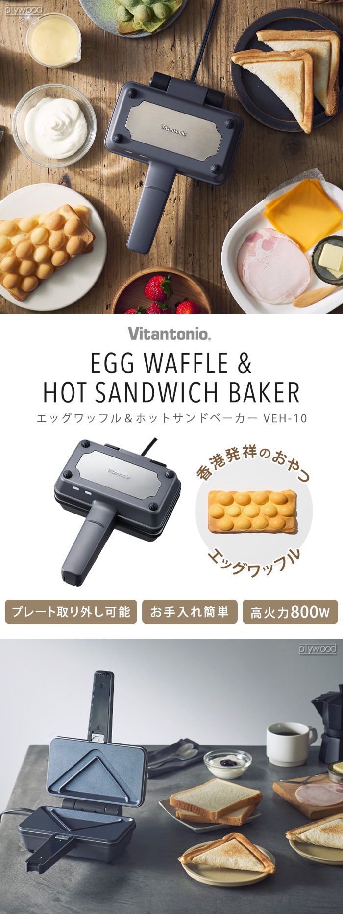 ビタントニオ エッグワッフル & ホットサンドベーカー プレート2種 VEH-10-K ホットサンドメーカー 電気 1枚 エッグワッフルメーカー Vitantonio バブルワッフルメーカー パッフル ポワソン 食パン 1枚焼き
