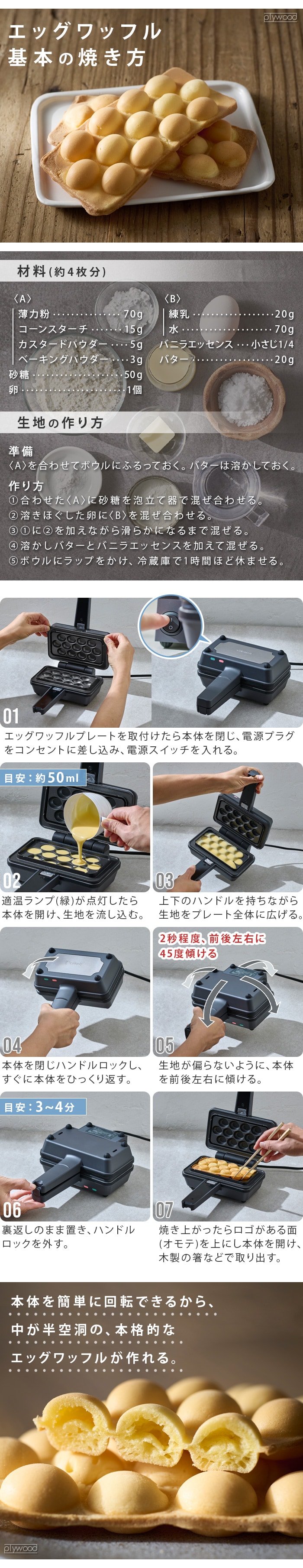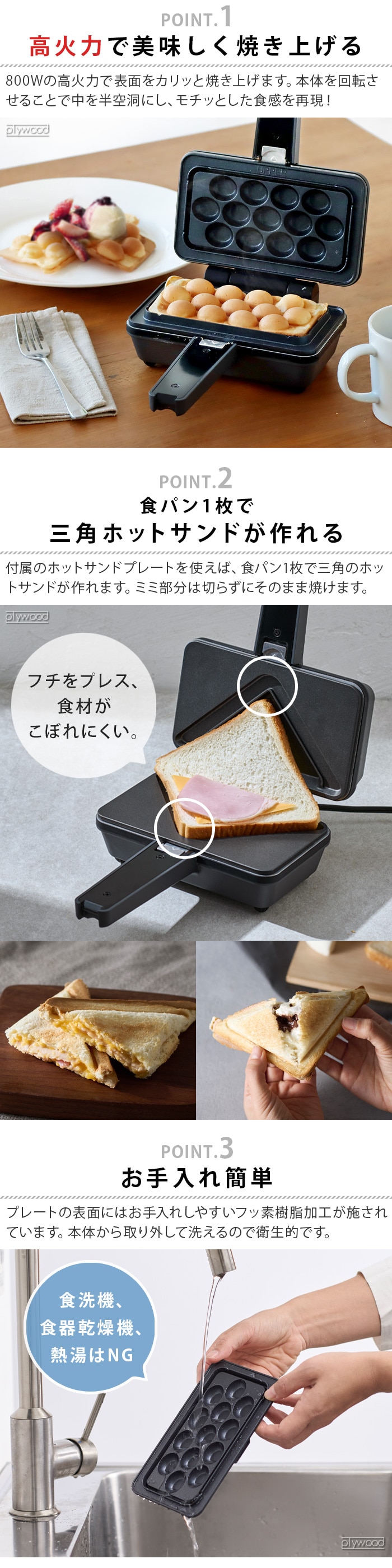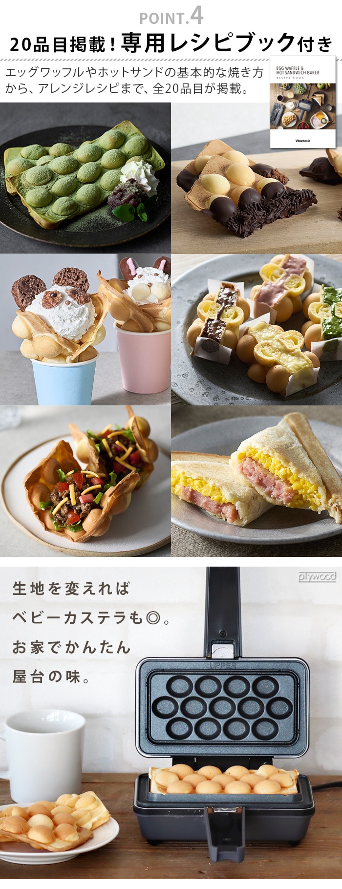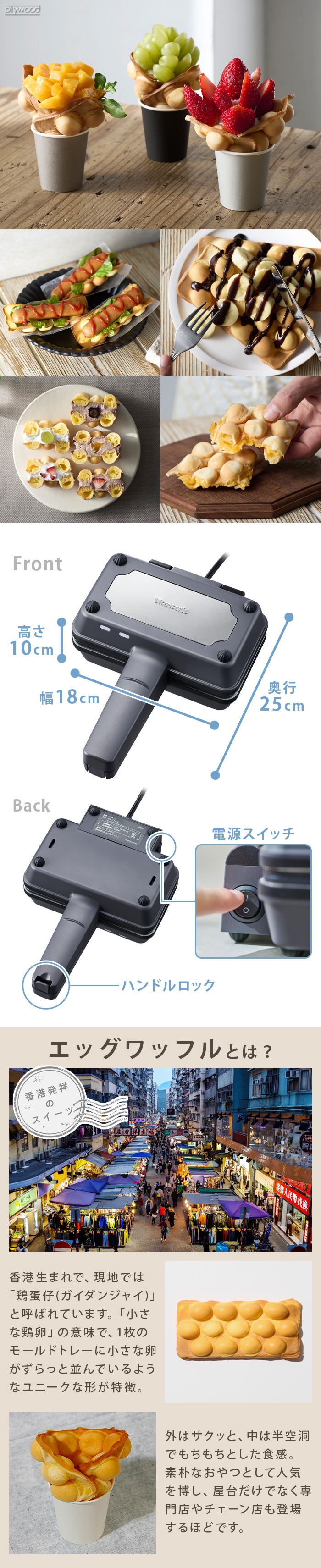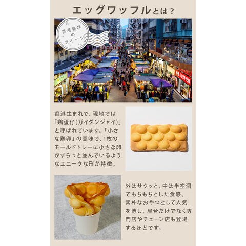 | 香港発のワッフル、サクッ・モチッな「エッグワッフル」が家庭で作れます。 1人用の食パン1枚焼きの三角ハーフホットサンドが作れます。 エッグワッフルプレートは上下でプレートの形状が異なります。「UPPER」(上プレート)が上側、「LOWER」(下プレート)が下側になるように取り付けてください。 |
