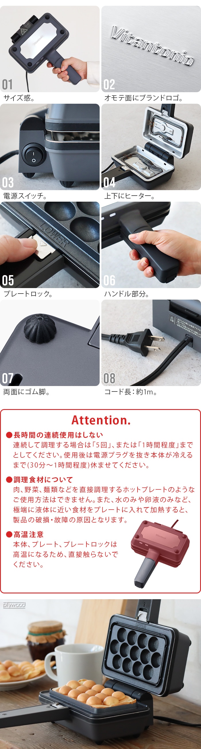 屋外では使用しない(屋内専用) 長時間の連続使用はしない 連続して調理する場合は「5回」、または「1時間程度」までとしてください。使用後は電源プラグを抜き本体が冷えるまで(30分〜1時間程度)休ませてください。 調理食材について 肉、野菜、麺類などを直接調理するホットプレートのようなご使用方法はできません。また、水のみや卵液のみなど、極端に液体に近い食材をプレートに入れて加熱すると、製品の破損・故障の原因となります。 高温注意 本体、プレート、プレートロックは高温になるため、直接触らないでください。 プレートを取り付ける際には必ず下プレートから順に取り付けてください。上プレートから取り付けると、上プレートの重さで本体が倒れる可能性があります。 突起部がしっかりと差し込まれていない状態で本体を閉じると、加熱されたプレートが脱落してやけどしたり、差し込み部周辺が破損する恐れがあります。 使用中のプレート及びプレートロックは大変熱くなっています。プレートの取り外しは本体が十分冷めてから行ってください。 ゴム脚が外れた状態で使用しない。テーブルなどに本体が直接触れると、変色や焦げる場合があります。 生地に含まれる水分により蒸気が出ることがあるため、本体をひっくり返す際や開ける際は注意する。 本体を開ける際は必ずオモテ側を上にする。 何度も本体をひっくり返す場合は、電源コードのねじれに注意する。一方向に回転し続けない。 |