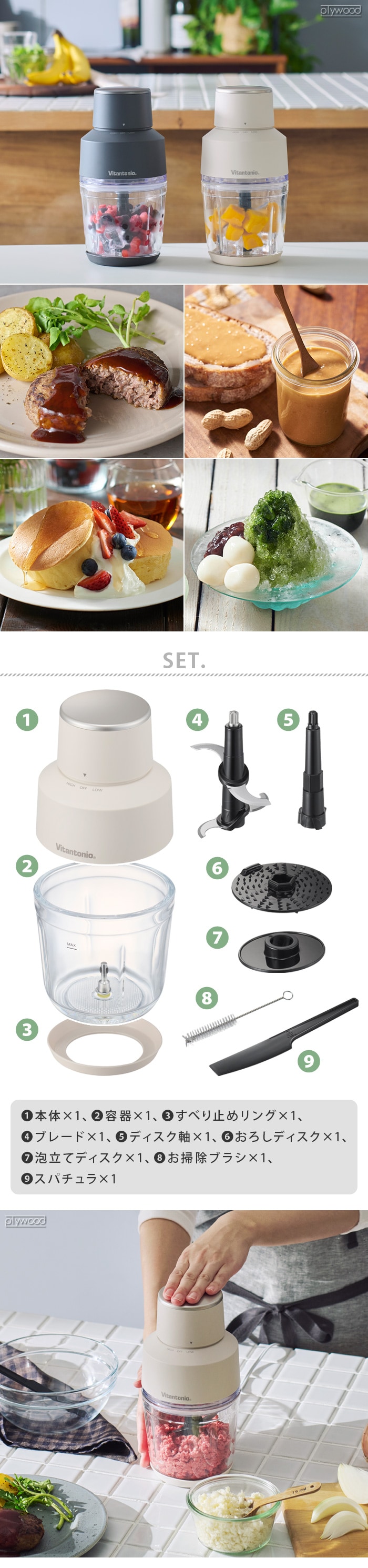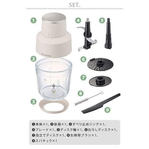 | 本体×1、容器×1、すべり止めリング×1、ブレード×1、ディスク軸×1、おろしディスク×1、泡立てディスク×1、お掃除ブラシ×1、スパチュラ×1、 |