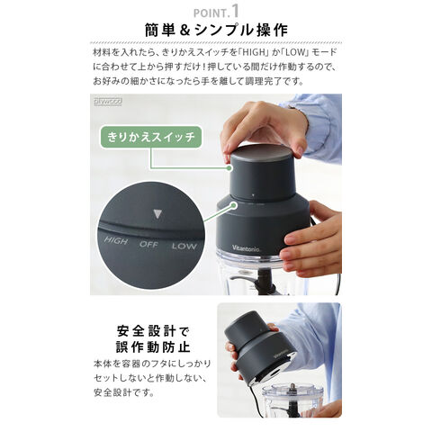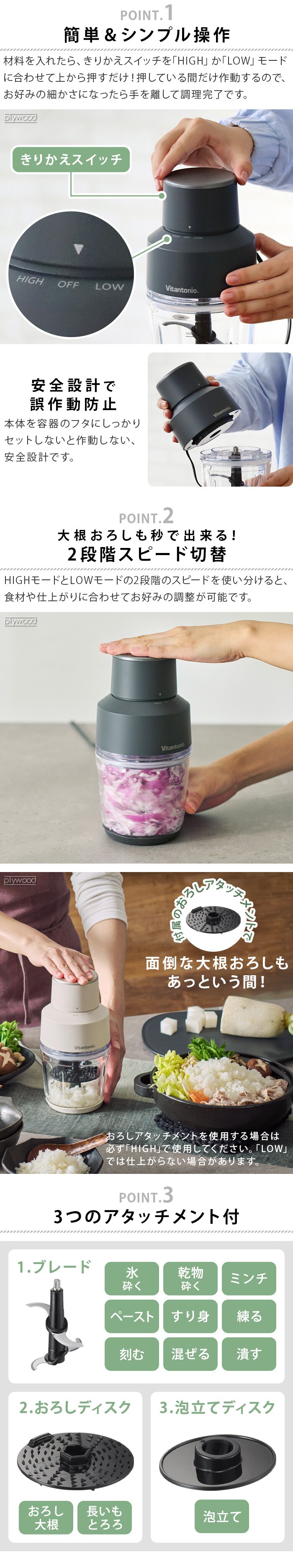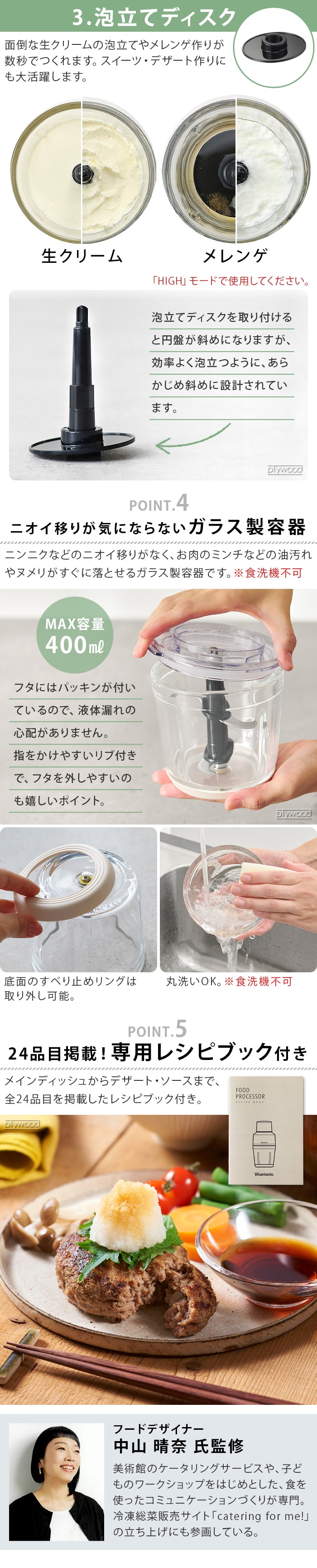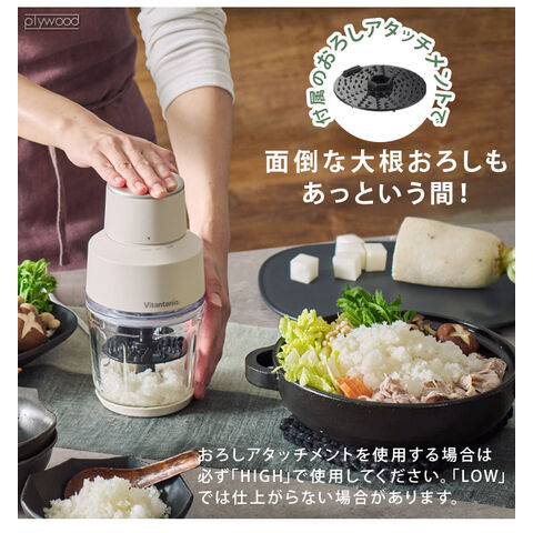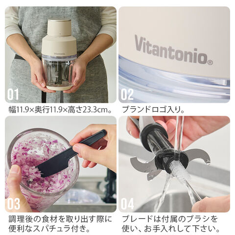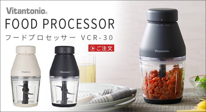 下ごしらえからデザートまで作れる フードプロセッサー Vitantonioから、「フードプロセッサー」のご紹介です。3種類のアタッチメントを使い分ければ1台12役!毎日の料理の下ごしらえからクラッシュアイス、デザートまで、幅広く活躍してくれます。ガラス容器は食材の匂い移りや油のヌメリもすぐに落ちるのでお手入れも簡単です。 |