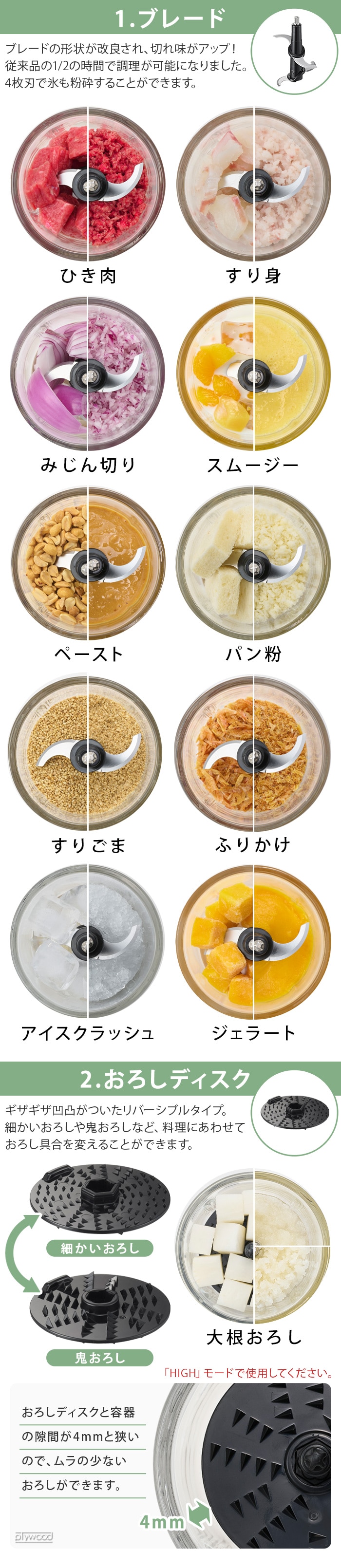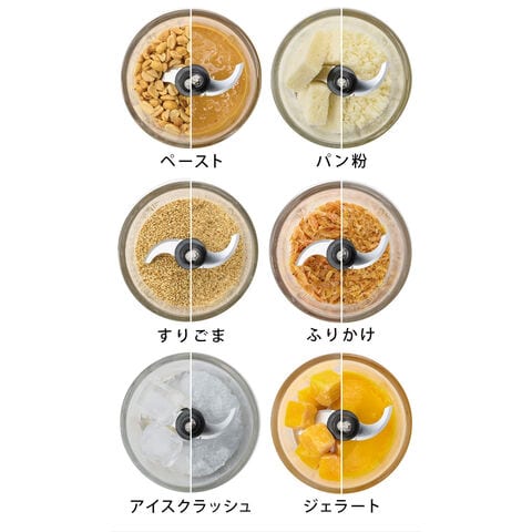≪ブレード≫ [硬い食材] 市販の氷、乾燥大豆、乾燥昆布、コーヒー豆、硬いチーズなど [生地こね] パン、ケーキ、パイ生地作りなど [粘りの強い食材] ゆでたじゃがいも、納豆、はちみつ、水あめなど ≪おろしアタッチメント≫ [硬い食材・柔らかい食材] チーズ、トマトなど [粘りの強い食材] 自然薯、やまいもなど |
