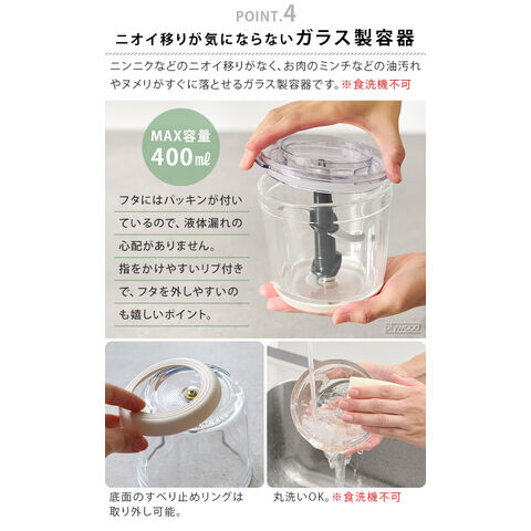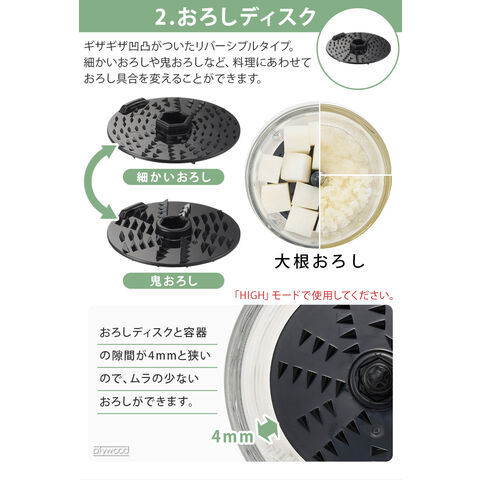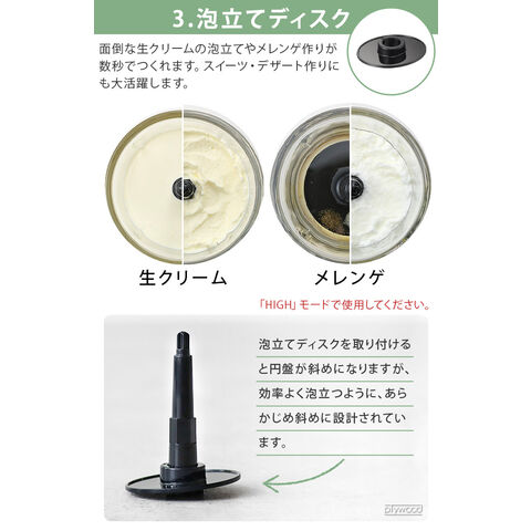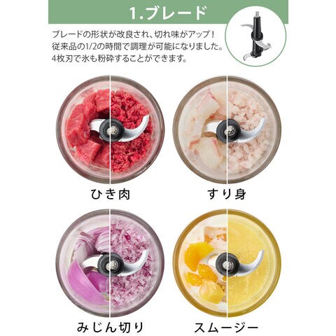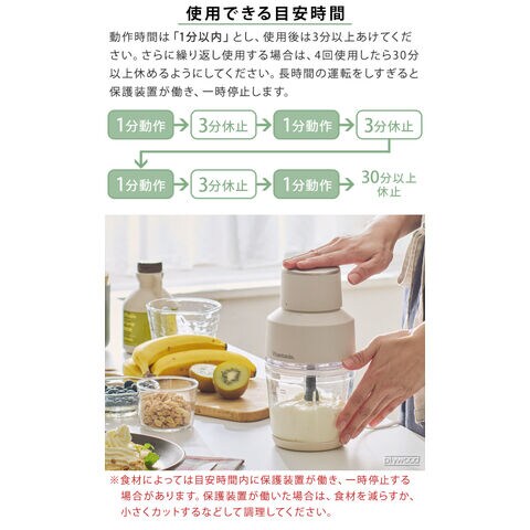 | 食器洗浄機・食器乾燥機類は使用不可。 食材を撹拌する際は一口大約2cm角以下にカットしてください。 本品はフードプロセッサーです。肉のひき肉や野菜のみじん切りに適しますが、ブレンダー、ミキサー、ミル、グラインダーなど全ての下ごしらえ調理機としてはご使用いただけません。食材をこねるような使い方は故障の原因となります。 食材によっては目安時間内に保護装置が働き、一時停止する場合があります。保護装置が働いた場合は、食材を減らすか、小さくカットすなどして調理してください。 |