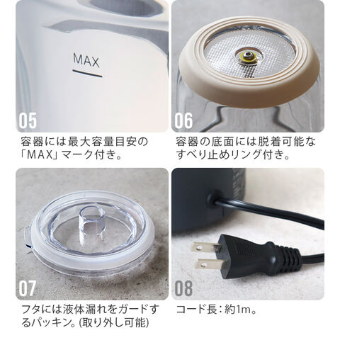 | 本体:ABS 容器:ガラス ブレード:ステンレス、POM おろし、泡立てディスク:ABS ディスク軸:POM |