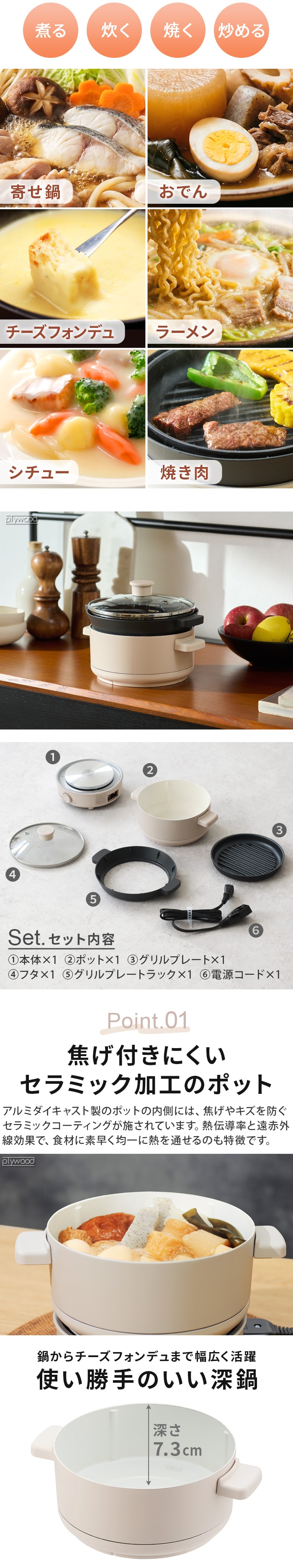 | 本体:PBT樹脂 ポット:アルミダイキャスト(セラミック加工) グリルプレート:アルミダイキャスト(フッ素樹脂) グリルプレートラック:フェノール樹脂 フタ:ガラス |