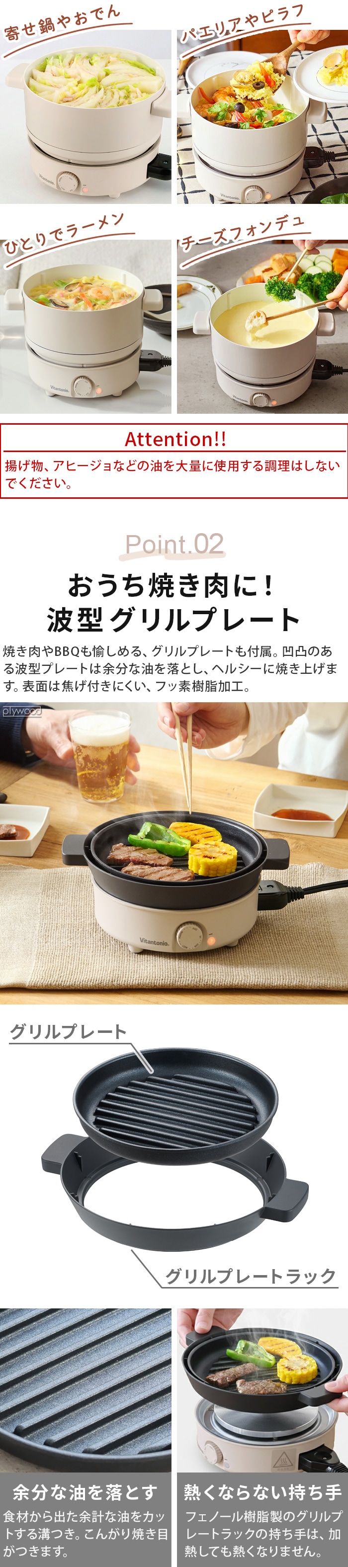 | 揚げ物、アヒージョなどの油を大量に使用する調理はしないでください。 ポット、グリルプレートは消耗品です。 ナイフやフォーク、金串など鋭利なものでこすらないでください。 表面に汚れが付着したまま放置しないでください。 食器洗浄機・食器乾燥機は使用不可。 収納時にフタはピッタリ閉りません。 ガラス製のフタはポット専用です。グリルプレートには使用できません。 ヒーターの上に付属のポット、グリルプレート以外の者はのせないでください。 直火、他の製品の熱源でポット、グリルプレートを加熱しないでください。 お手入れの際は研磨剤を含む洗剤やシンナー、ベンジン、工業用アルコール、磨き粉、金属タワシや化学ぞうきん等は使用しないでください。 本製品は一般家庭用です。 |