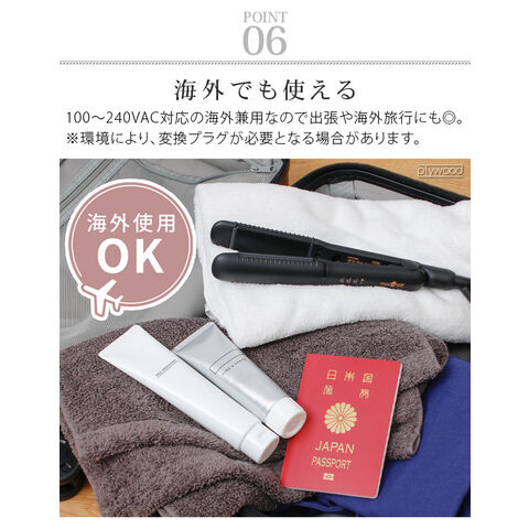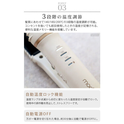 カールしやすいサイドコーム付き 140/180/200℃の3段階に温度調節可能 自動電源OFF機能付き(30分後) 約30秒で使えるクイックヒートアップ マイナスイオン搭載 温度メモリー機能搭載 海外兼用 ※環境により、変換プラグ(別売り)が必要となる場合があります。 |