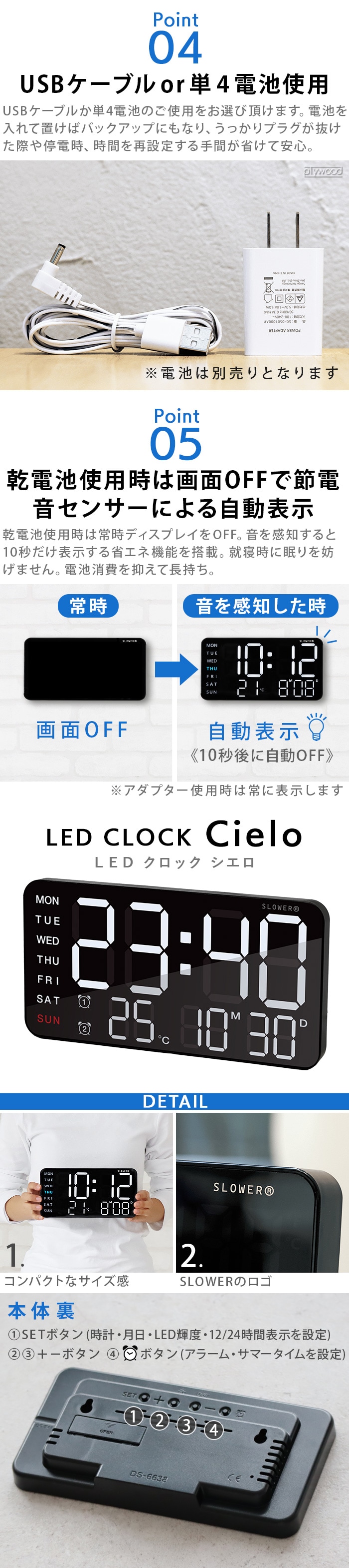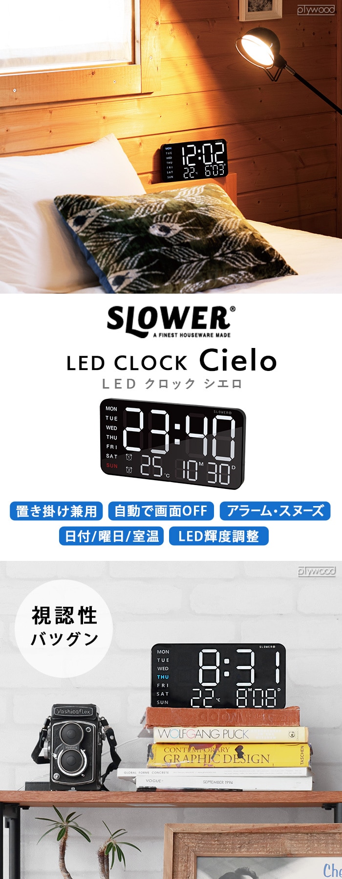 SLOWER LED CLOCK Cielo スロウワー LEDクロック シエロ ≪SLW366≫ 置き掛け兼用 デジタル時計 おしゃれ 目覚まし時計 LED輝度調整 自動画面オフ モダン 温度計 ブラック カレンダー デスククロック テーブルクロック ギフト
