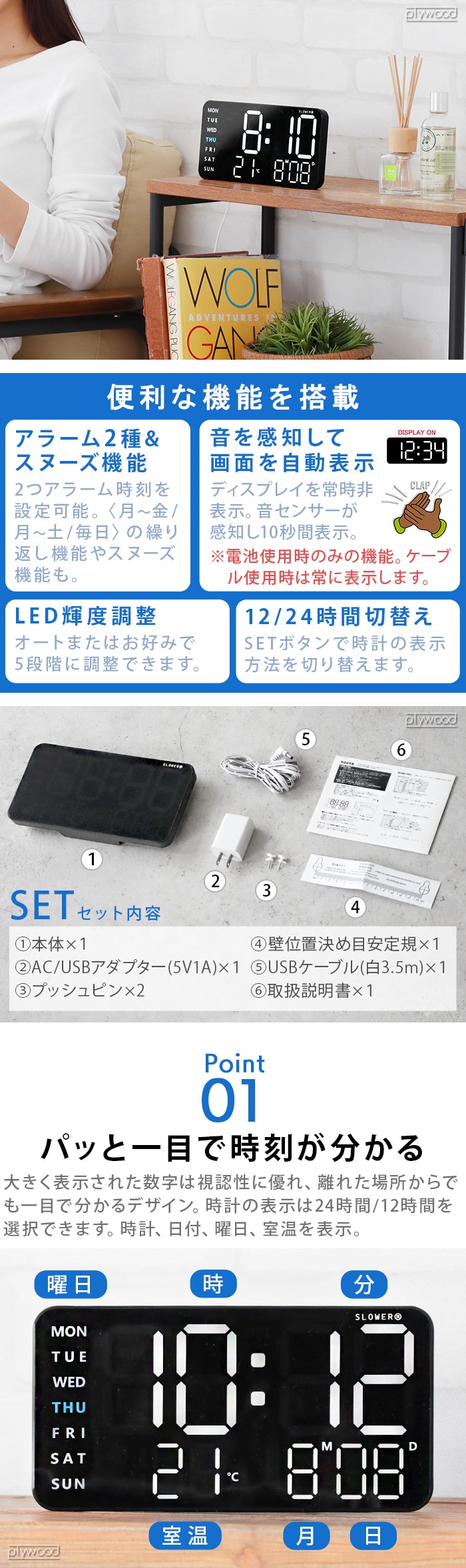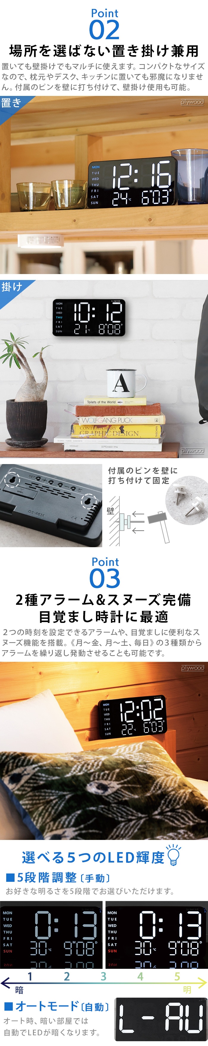 明るい場所でも暗い場所でも一目で時刻を確認できる、視認性抜群のデジタルLED時計。置きでも壁掛けでも使えて、LED輝度は5段階で調整できます。アラーム、スヌーズ機能を搭載し、目覚まし時計としても活躍!USBケーブルor乾電池使用が可能。乾電池使用時は常時ディスプレイをOFFし、音センサーが感知すると10秒だけ表示する省エネ機能を搭載。寝室やリビング、デスクトップなどシーンに合わせてお使いください。
