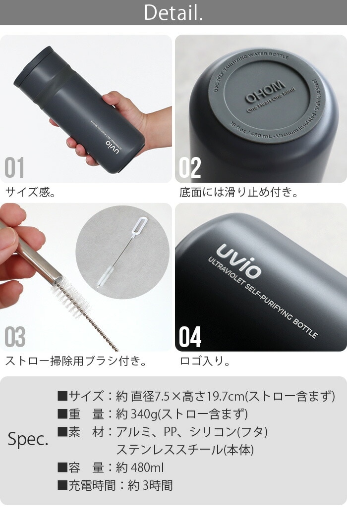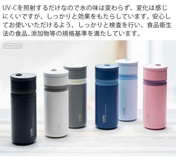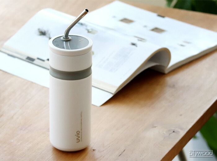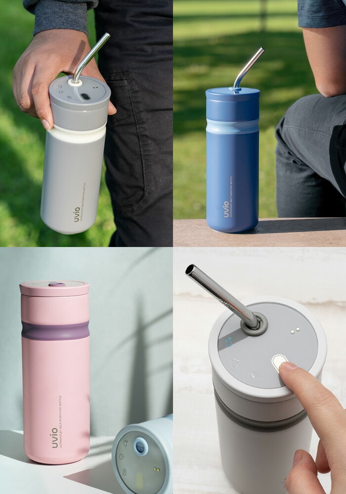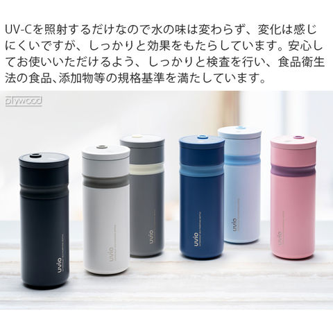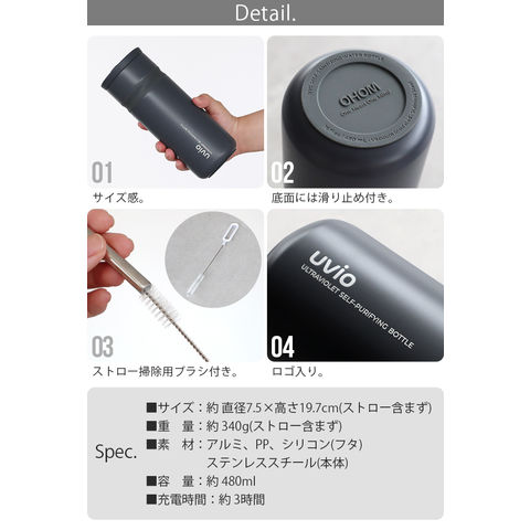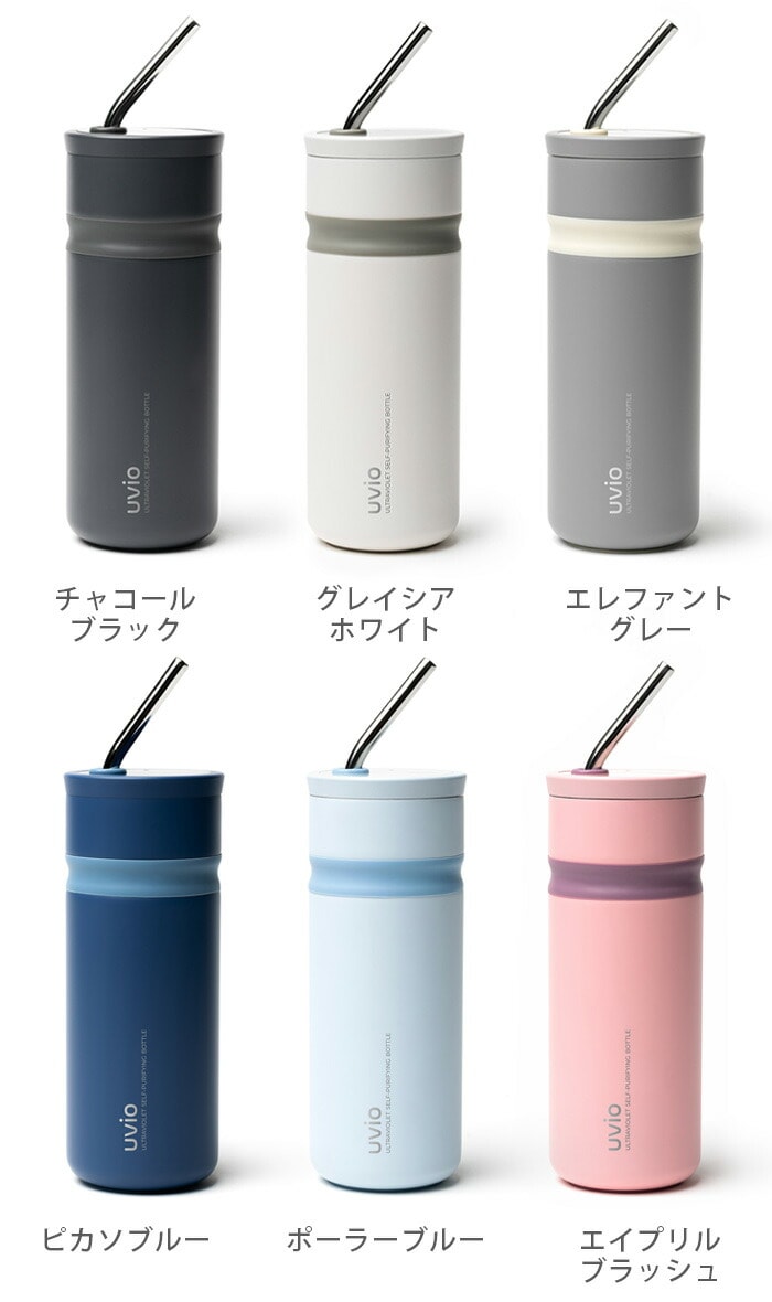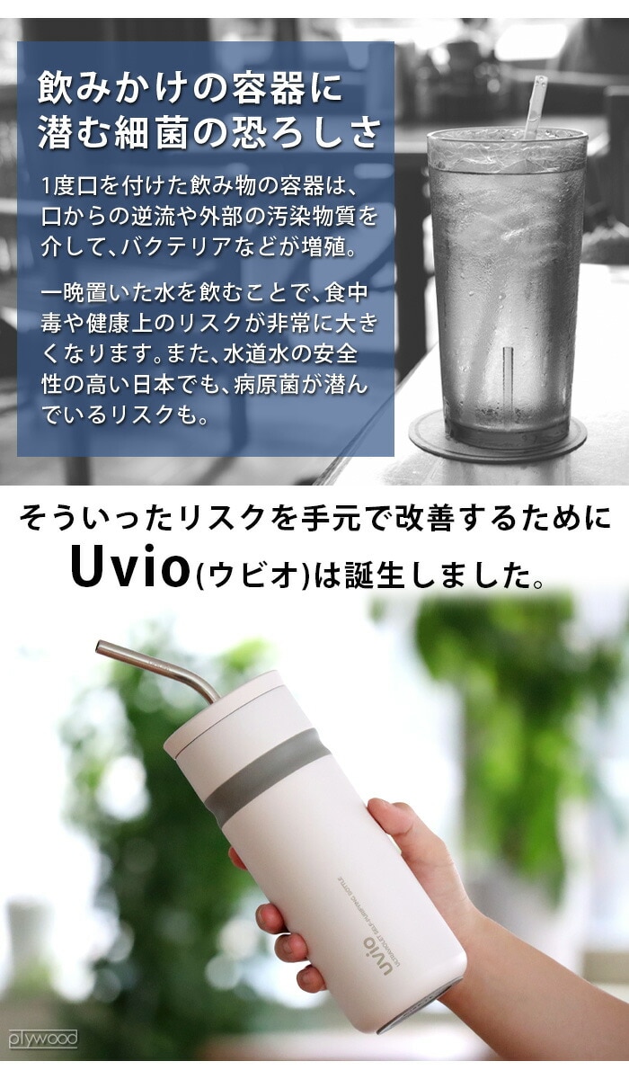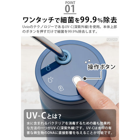 飲みかけの水も ワンタッチで衛生的に いつでもキレイな水が飲める、最先端UV-Cテクノロジー搭載のウォーターボトル「Uvio(ウビオ)」のご紹介です。本体上部に備え付けられたボタンをワンタッチするだけで起動し、1〜3分の間、Uvioのテクノロジーである最先端のUV-C(深紫外線)を飲料水に照射。簡単な動作で99.9%のバクテリアを除去することができます。ストロー仕様なので片手で簡単に飲めるのも◎。※水以外は推奨していません(液体が透明でないとUV-Cが下まで届かないため)。 |