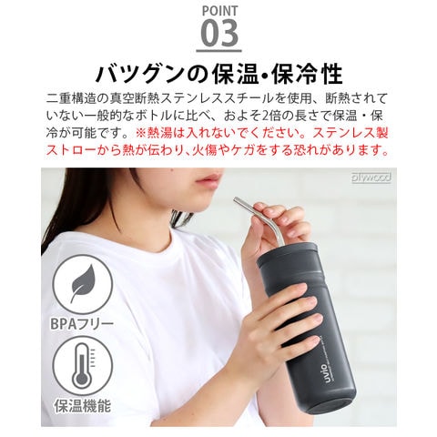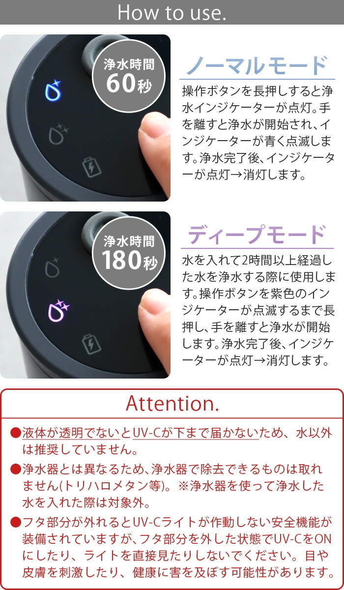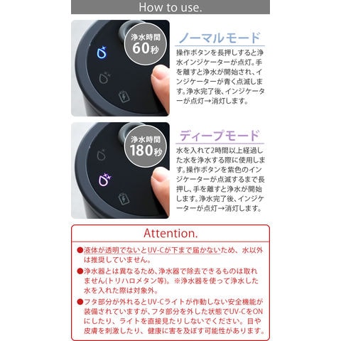 液体が透明でないとUV-Cが下まで届かないため、水以外は推奨していません。 浄水器とは異なるため、浄水器で除去できるものは取れません(トリハロメタン等)。 ※浄水器を使って浄水した 水を入れた際は対象外。 フタ部分が外れるとUV-Cライトが作動しない安全機能が装備されていますが、フタ部分を外した状態でUV-CをONにしたり、ライトを直接見たりしないでください。目や皮膚を刺激したり、健康に害を及ぼす可能性があります。 熱湯は入れないでください。ステンレス製ストローから熱が伝わり、火傷やケガをする恐れがあります。 【次のものは入れないでください】 ドライアイス 炭酸飲料 不純物が含まれる飲料水 飲料水以外(コーヒー/お茶/ジュース/スポーツ飲料/酒類) 塩分も含む飲み物 熱湯 |