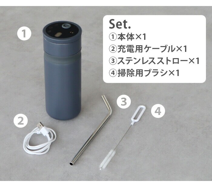 | 本体×1、充電用ケーブル×1、ステンレスストロー×1、掃除用ブラシ×1 |