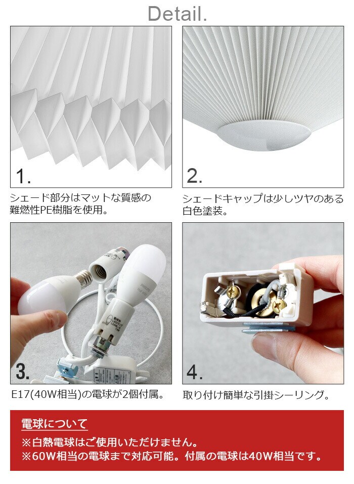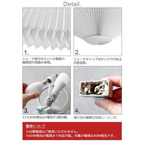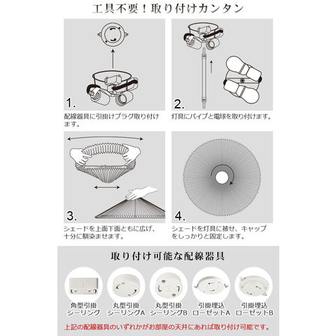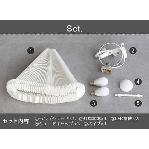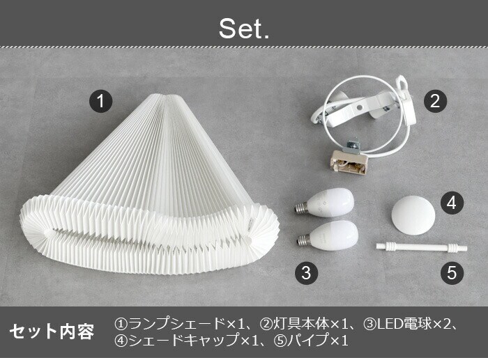 | ランプシェード×1、灯具本体×1、LED電球(40W相当)×2、シェードキャップ×1、パイプ×1 |