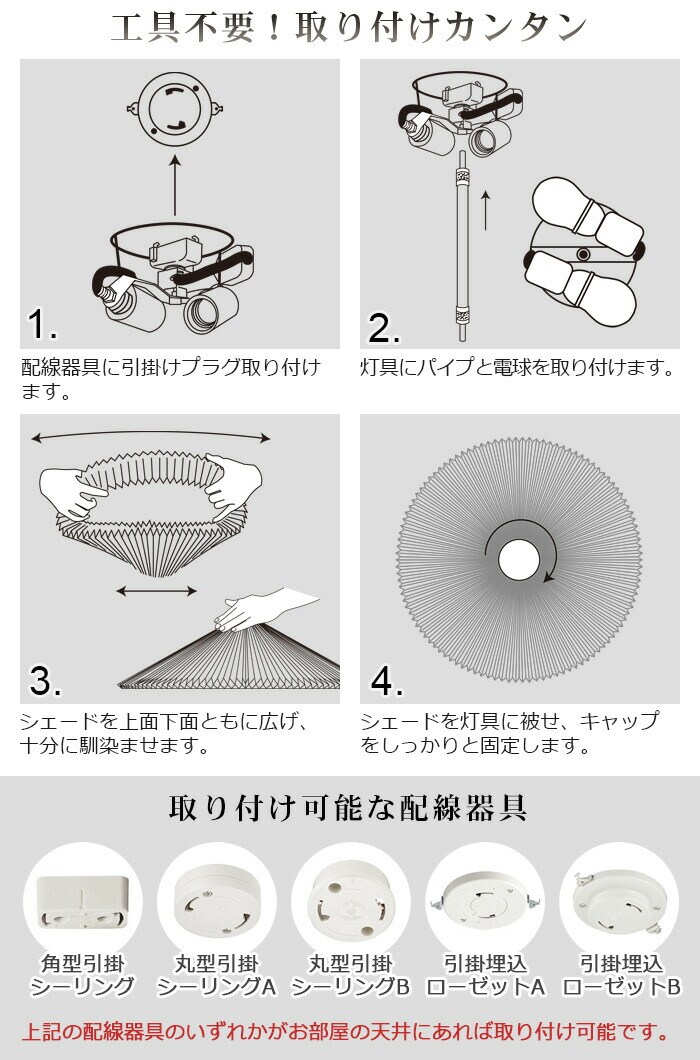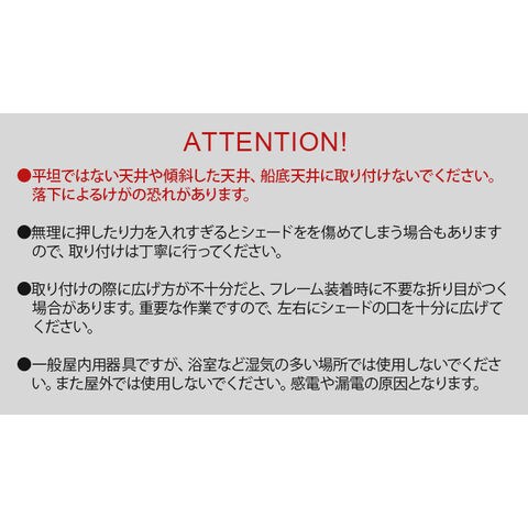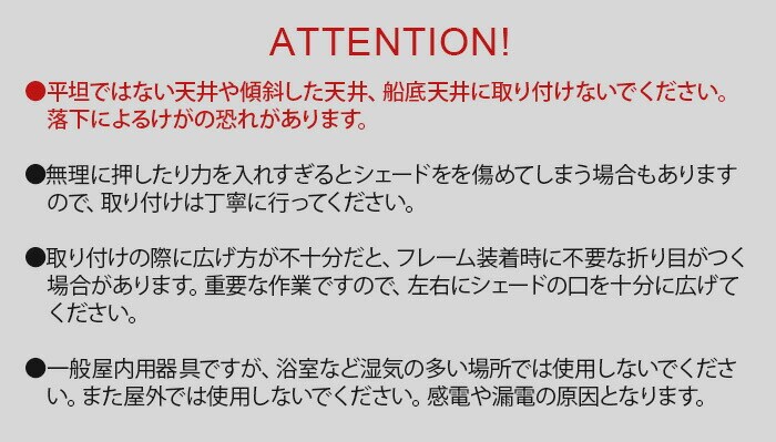 | 平坦ではない天井や傾斜した天井、船底天井、格天井、竿縁天井など凹凸のある天井に取り付けないでください。落下によるけがの恐れがあります。 無理に押したり力を入れすぎるとシェードをを傷めてしまう場合もありますので、取り付けは丁寧に行ってください。 取り付けの際に広げ方が不十分だと、フレーム装着時に不要な折り目がつく場合があります。重要な作業ですので、左右にシェードの口を十分に広げてください。 一般屋内用器具ですが、浴室など湿気の多い場所では使用しないでください。また屋外では使用しないでください。感電や漏電の原因となります。 |