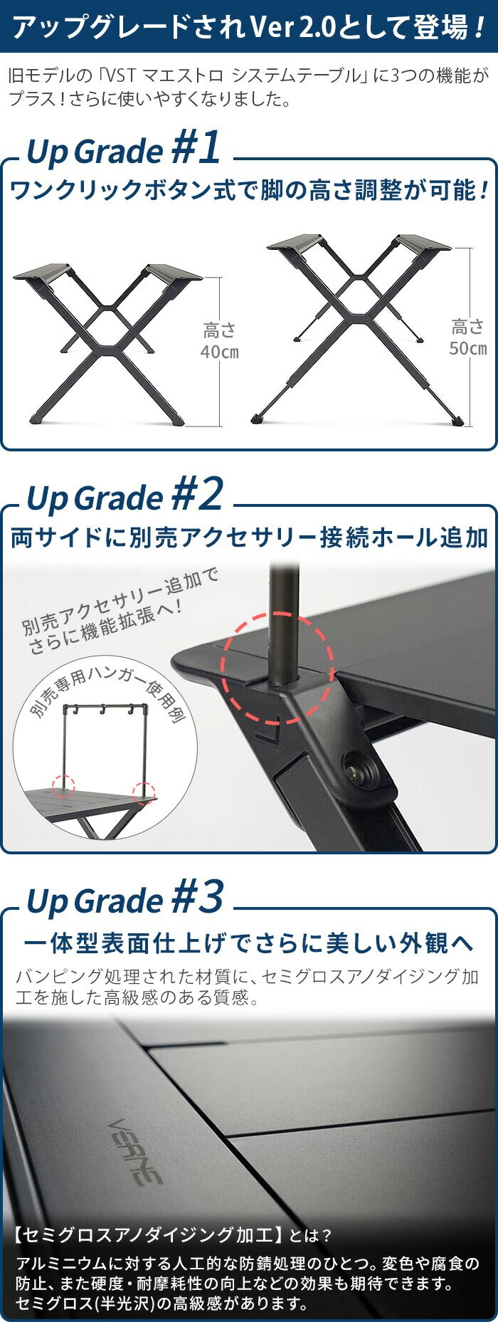 | ※2024年4月に仕様変更しました。 「VERNE VST Maestro SYSTEM TABLE Black VR-VV-21M4」の後継モデルです。旧モデルとは仕様が異なります。 【変更箇所】 ・ワンクリックボタン式で、簡単に脚の高さが調整できるようになりました。(高さ40~50cm) ・両サイドに「別売アクセサリー接続ホール」が追加されました。 ・バンピング処理をされた材質に、セミグロスアノダイジング加工を施しさらに高級感のある表面の質感になりました。 |