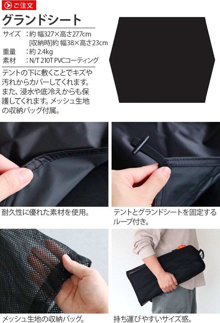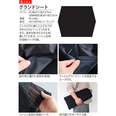 | こちらはグランドシート(SHELTER G GROUND SHEET)のみの販売です。本体・メッシュドア・TPUドアは別売りです。 |